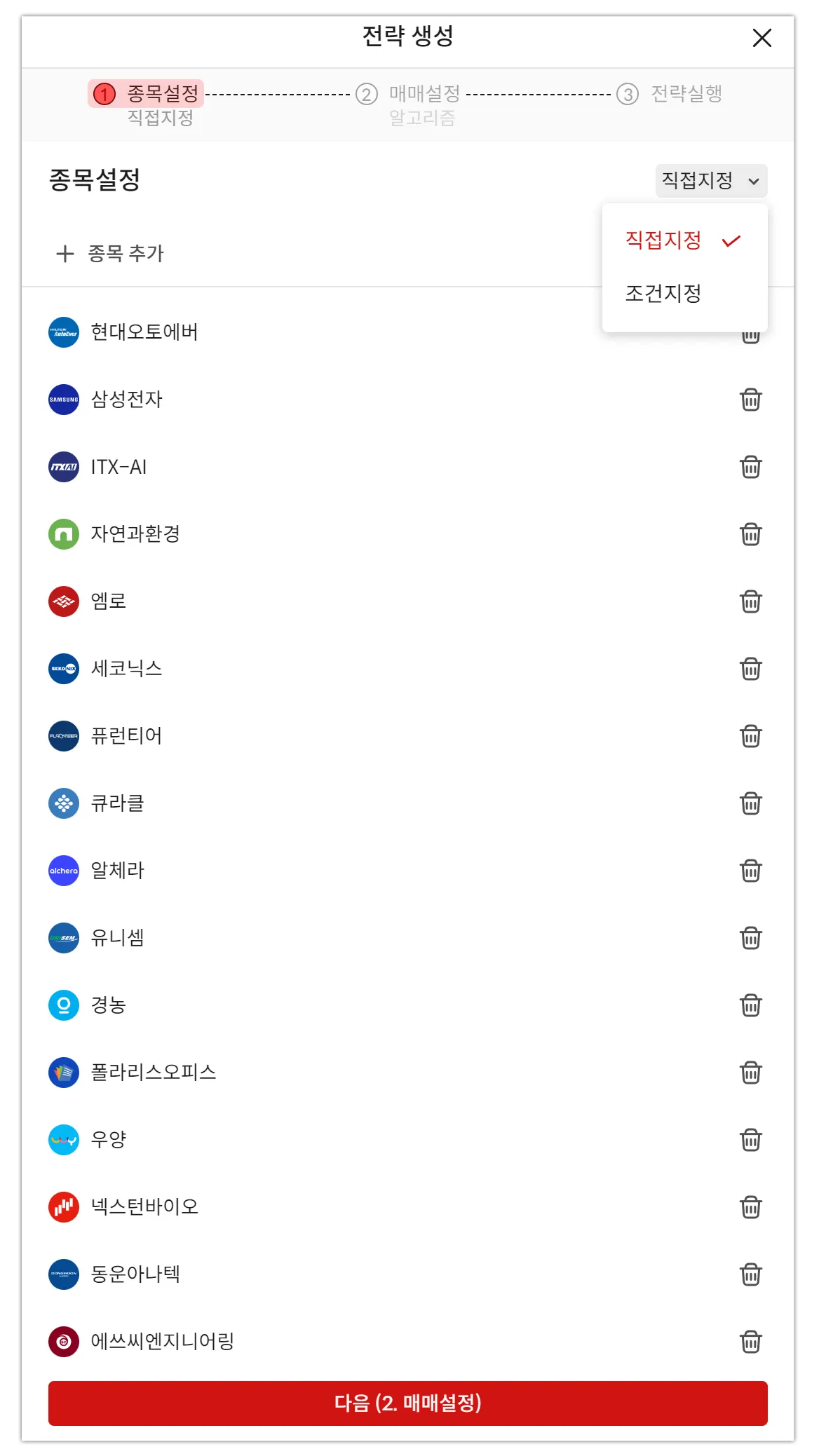 Step 1. 종목설정: 유저가 원하는 종목 범위를 설정할 수 있습니다. 종목은 최대 50개까지 지정할 수 있습니다.