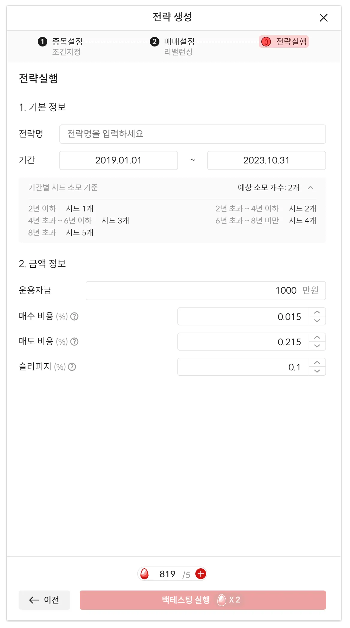 Step3. 전략실행: 백테스팅 실행 기간과 운용자금을 지정할 수 있습니다.