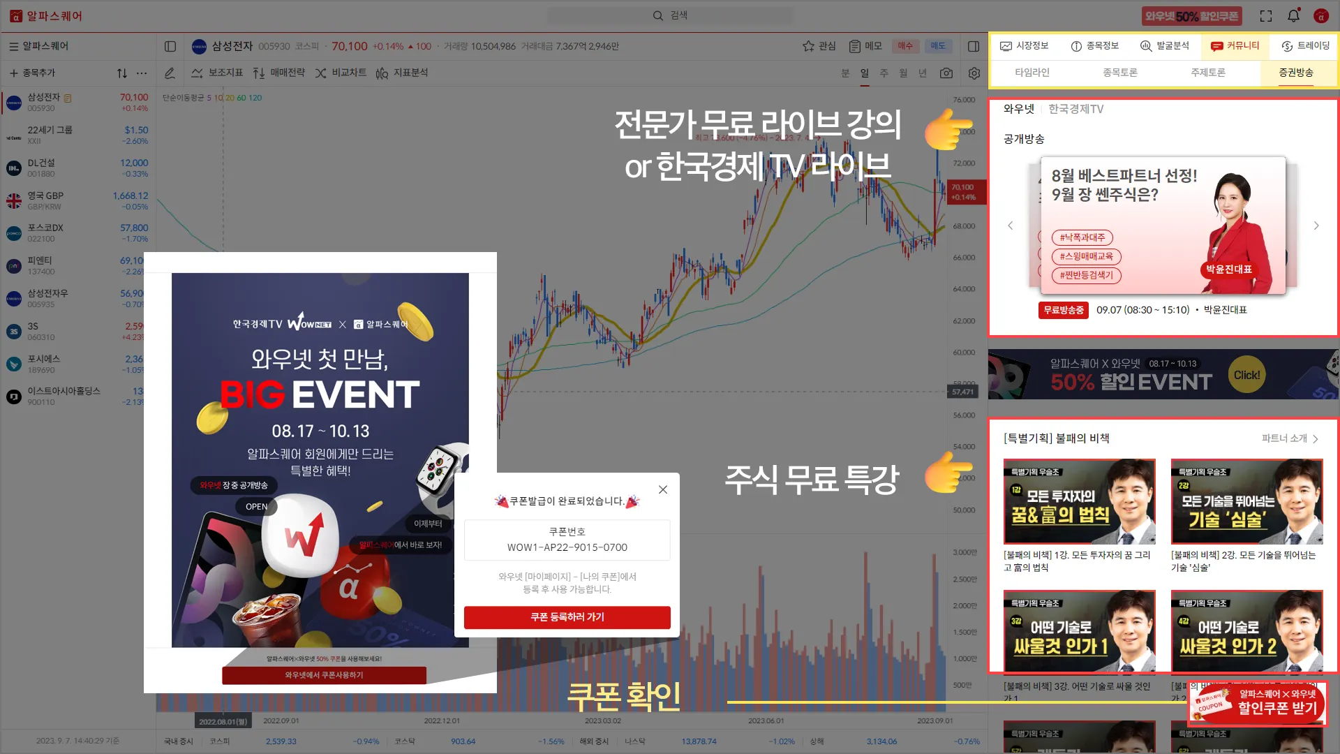 알파스퀘어가 증권방송 플랫폼 한국경제 TV의 ‘와우넷’과 함께 ‘증권방송’ 서비스를 출시하였습니다. 주식 전문가들의 고퀄리티 라이브 강의를 무료로! 만나보세요.