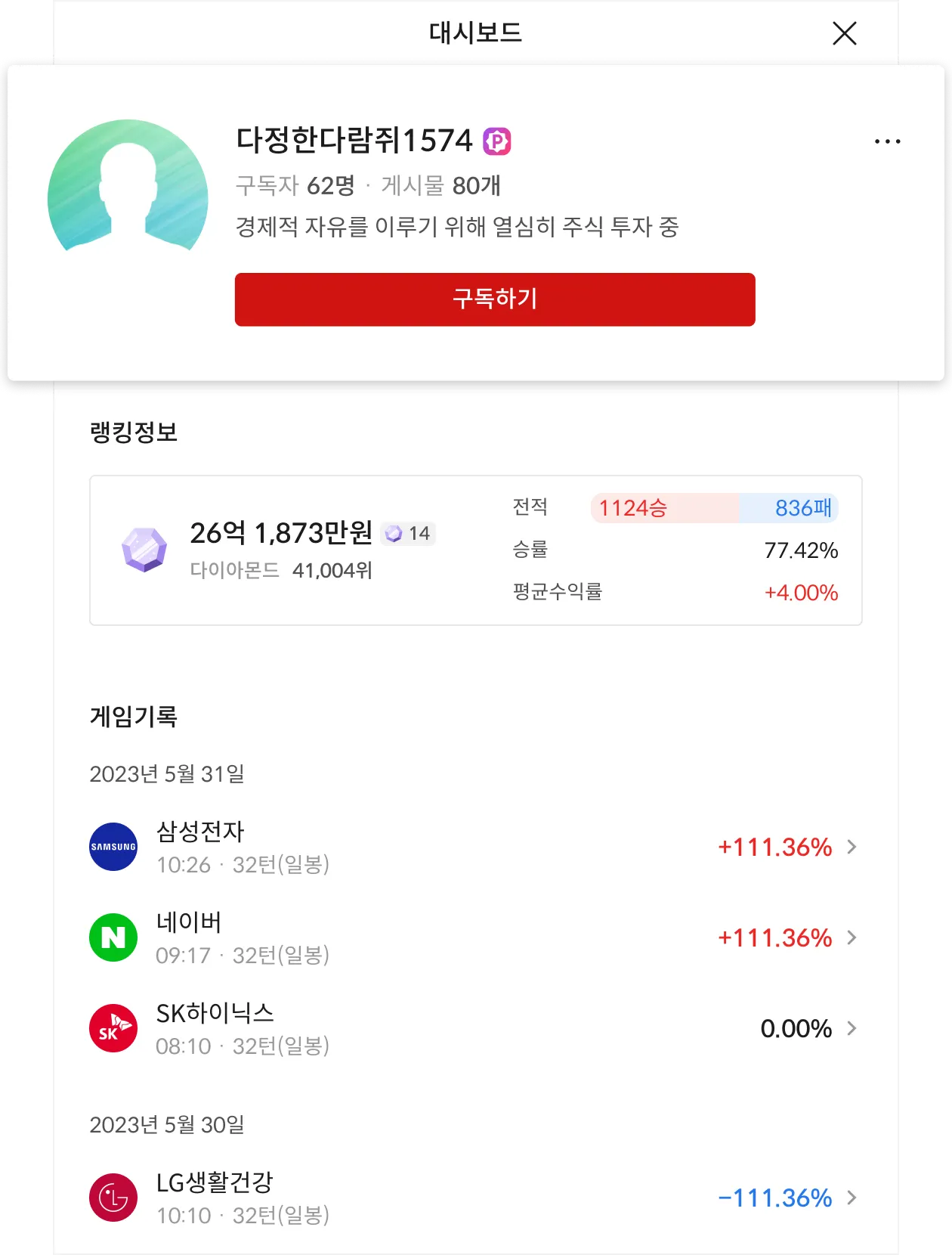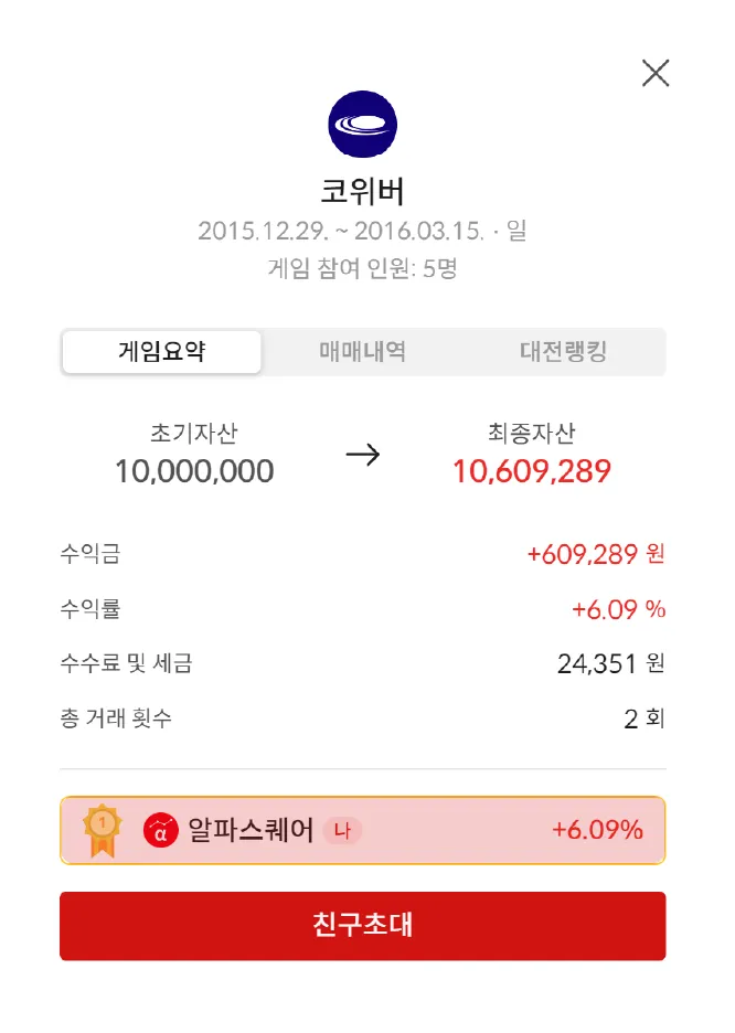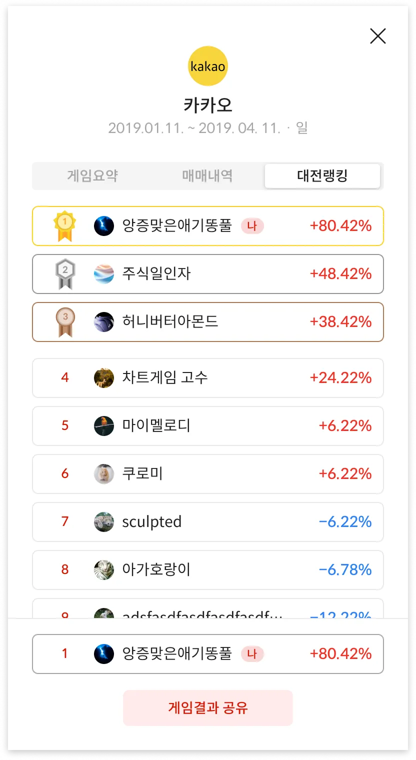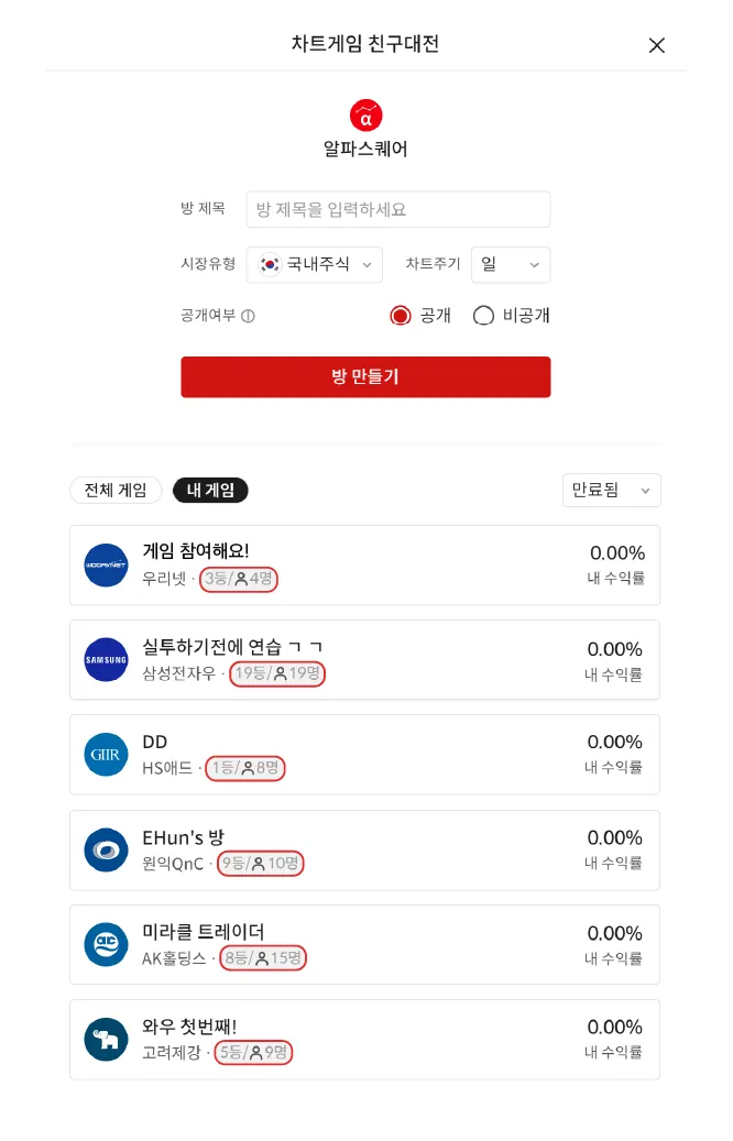 친구대전의 게임결과 및 만료된 게임에서 나의 등수와 수익률을 볼 수 있는 기능이 추가되었습니다.