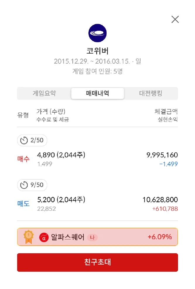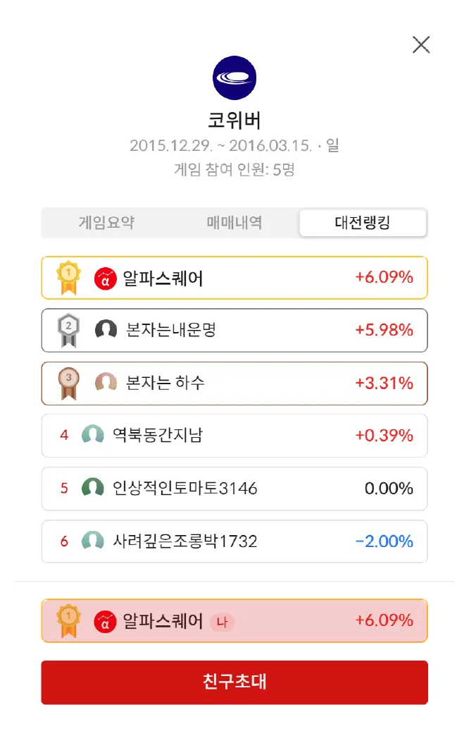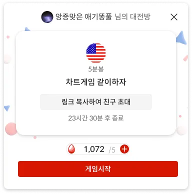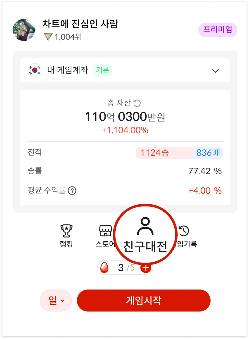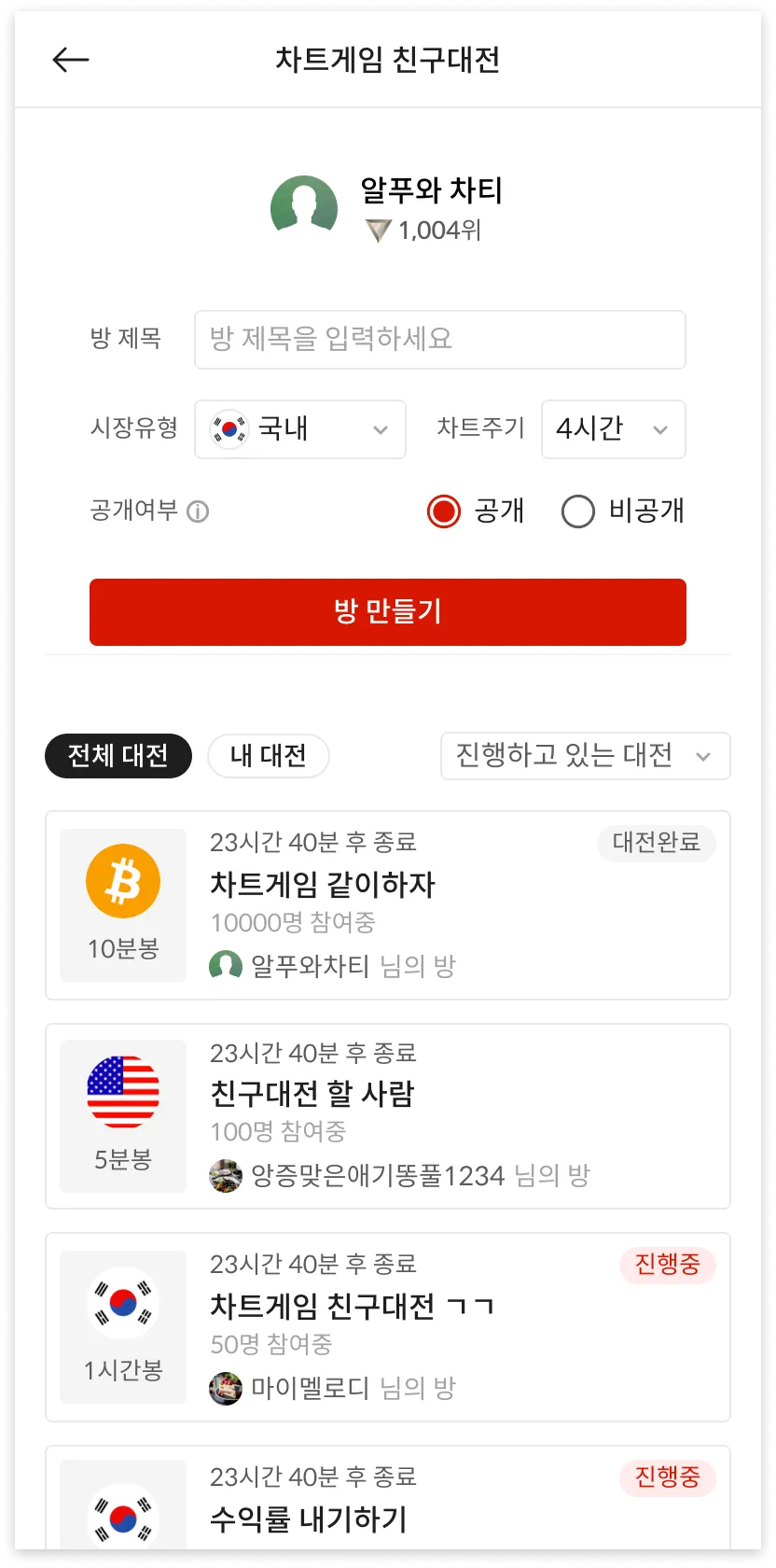 친구대전은 다른 유저들과 동일한 차트로 게임을 하고, 수익률을 비교하여 실력을 겨뤄 볼 수 있는 기능입니다.