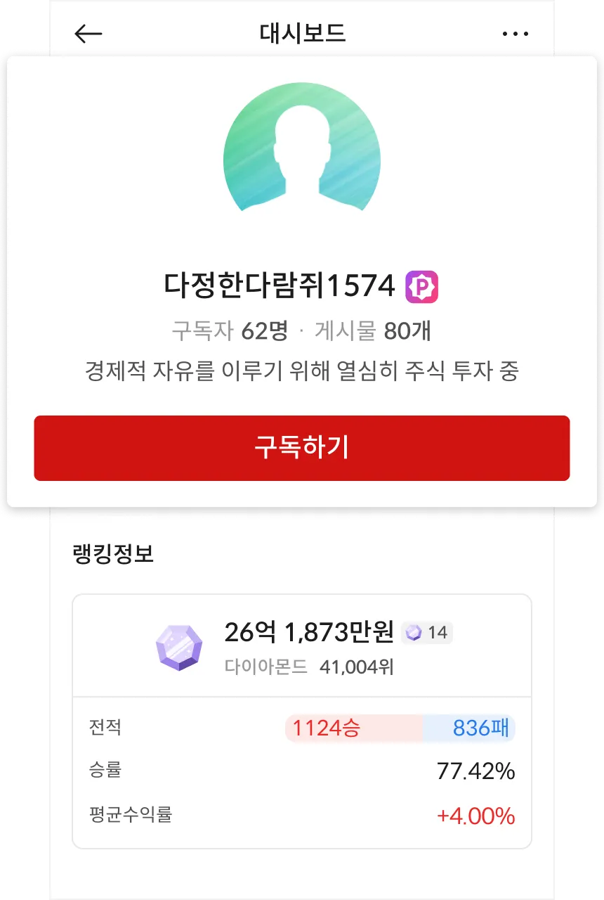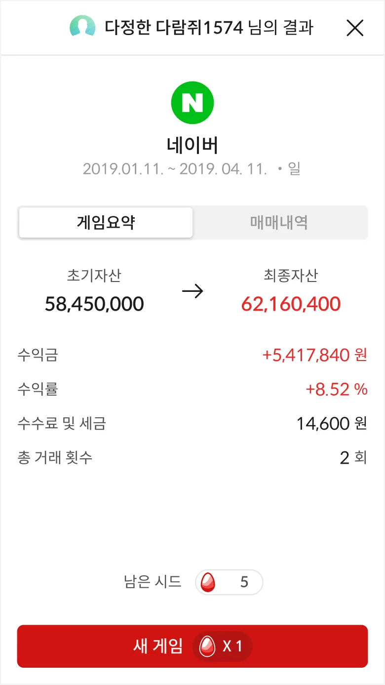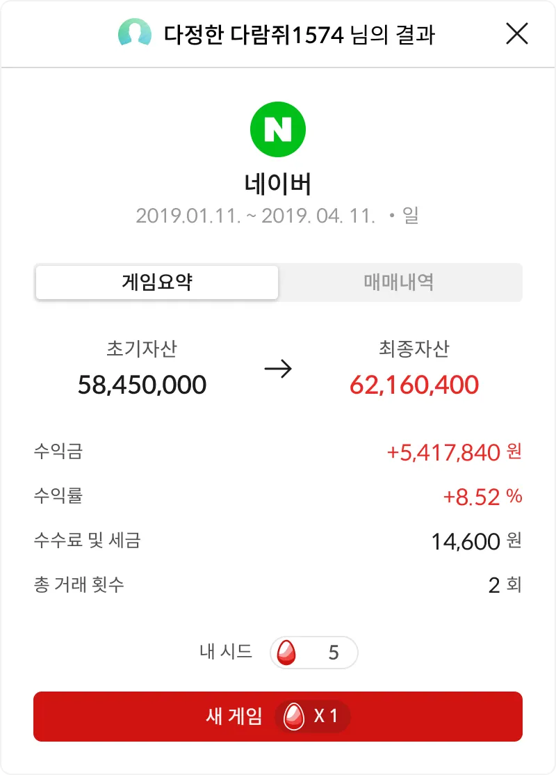 친구대전은 다른 유저들과 동일한 차트로 게임을 하고, 수익률을 비교하여 실력을 겨뤄 볼 수 있는 기능입니다.