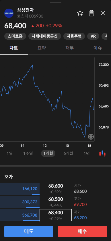 선택한 기간만큼의 차트 데이터를 확인할 수 있으며 라인차트와 - 봉차트를 전환할 수 있습니다.