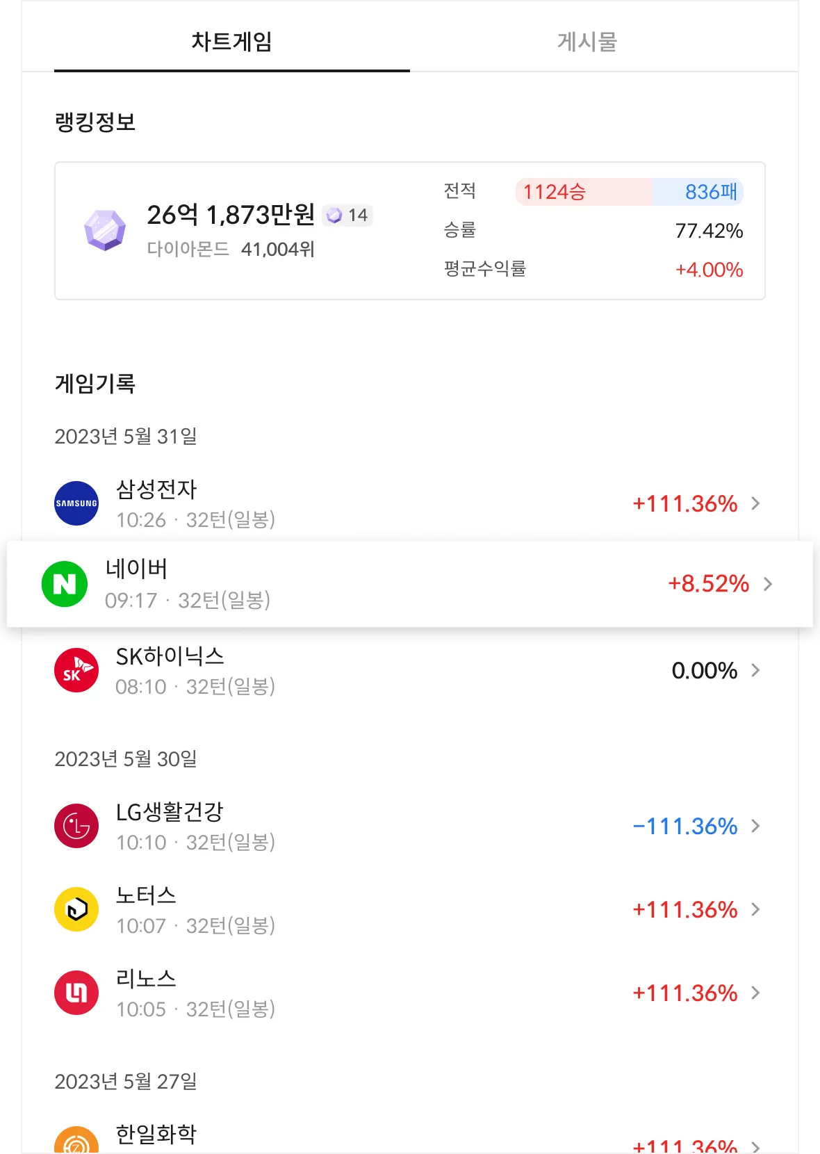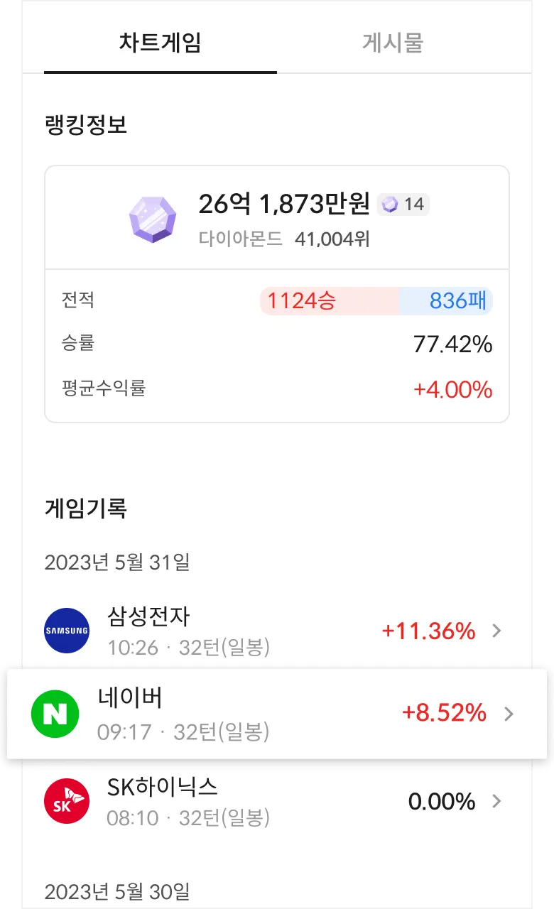 차트게임 탭이 추가되어 다른 유저들의 랭킹정보를 볼 수 있게 됩니다.