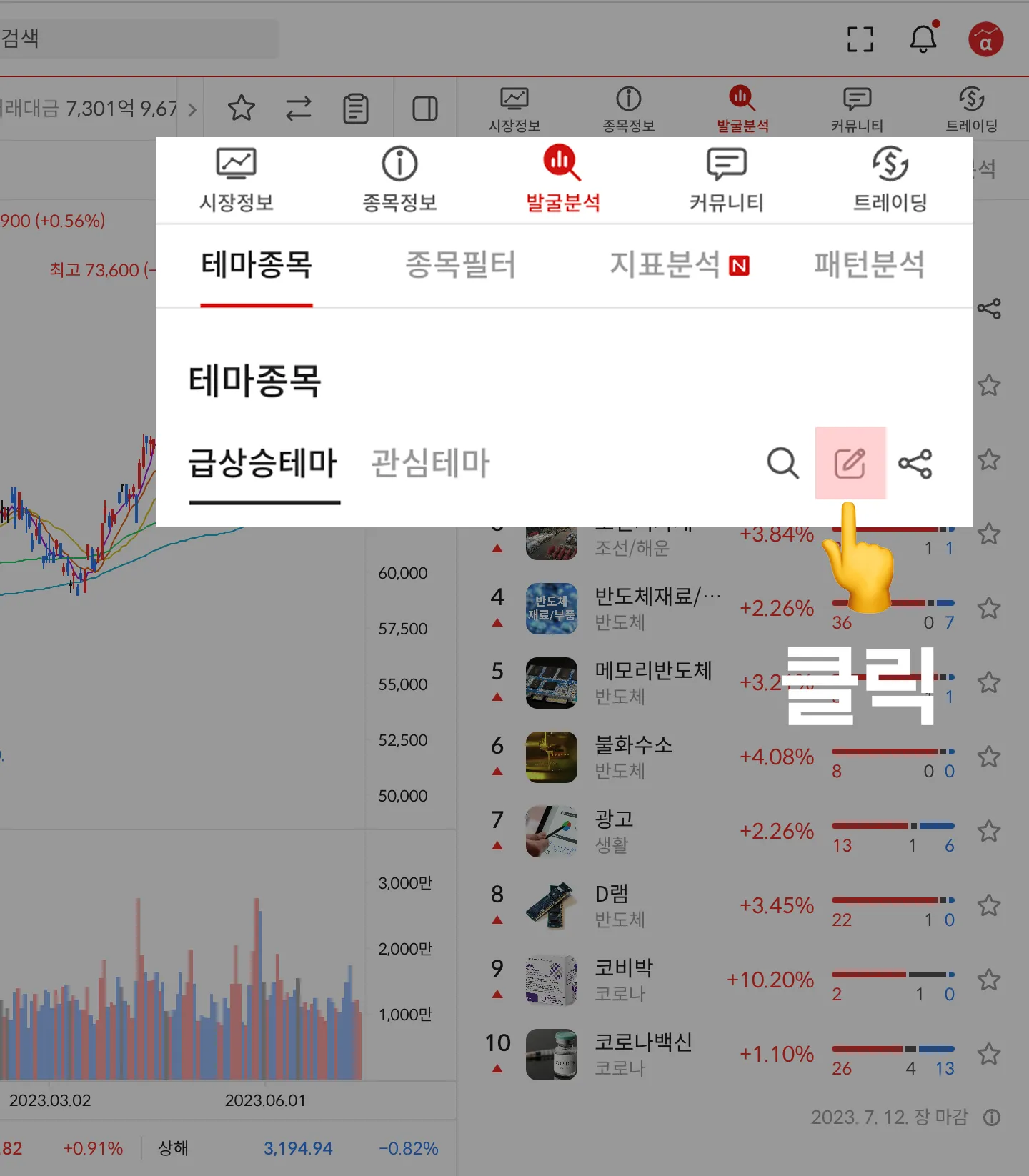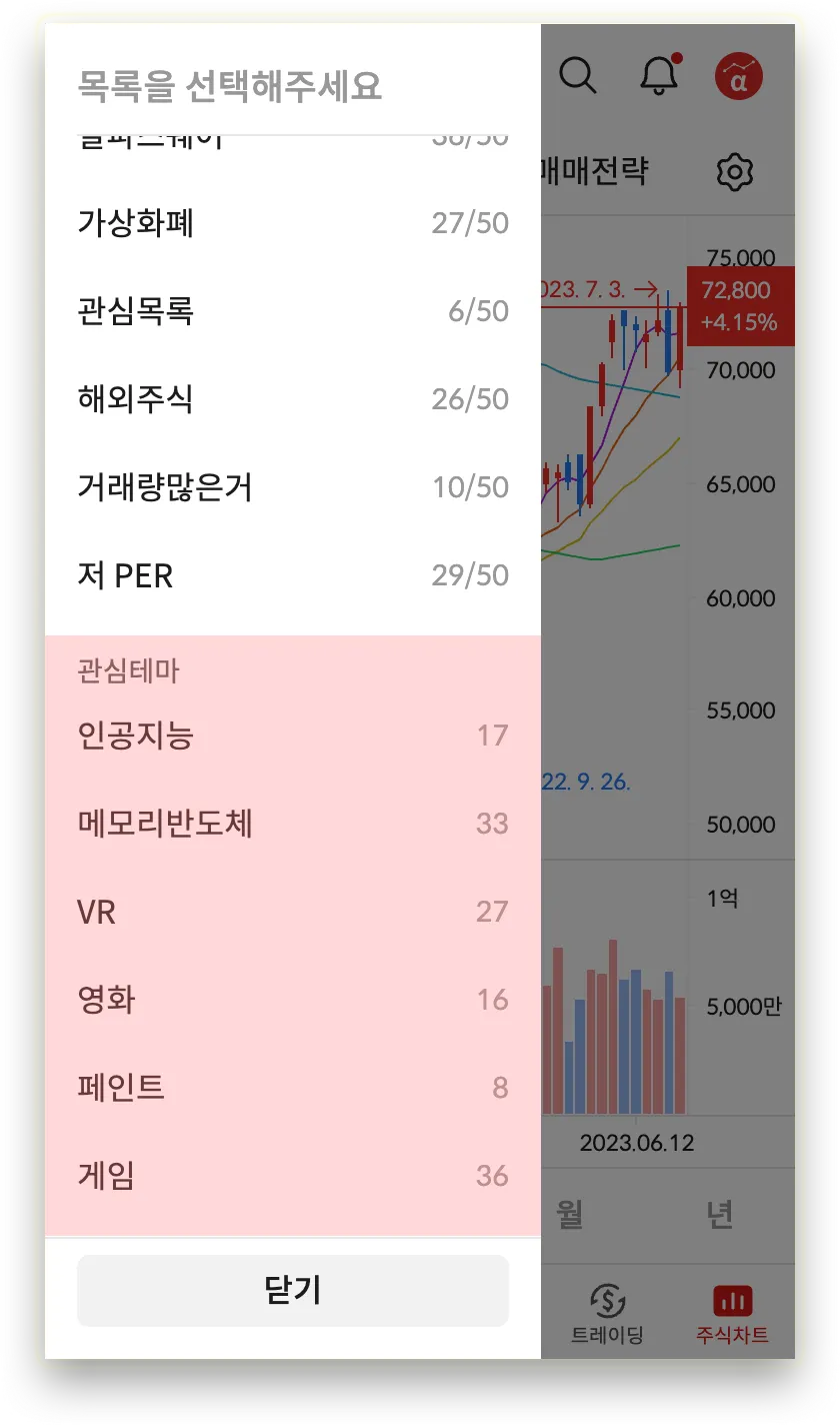 간편 종목변경창 내부에 내가 등록한 관심테마와 테마별 종목 리스트를 선택할 수 있습니다.