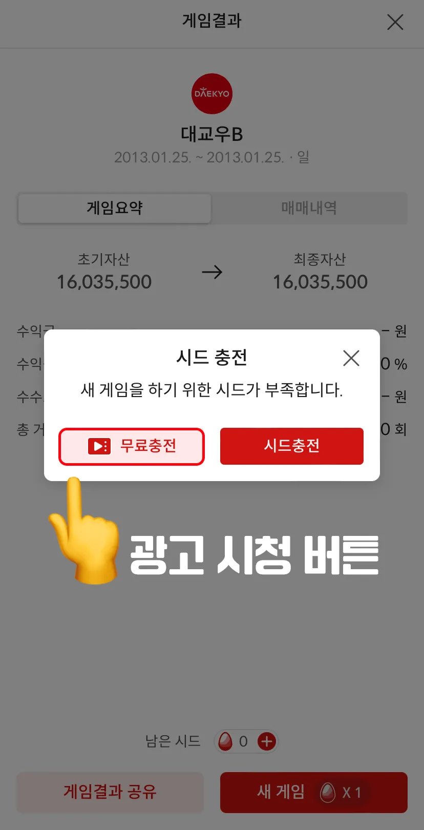 시드를 모두 사용한 경우, 게임 시작 버튼이 무료충전으로 바뀌며 이를 클릭하면 광고 영상을 시청할 수 있습니다.
