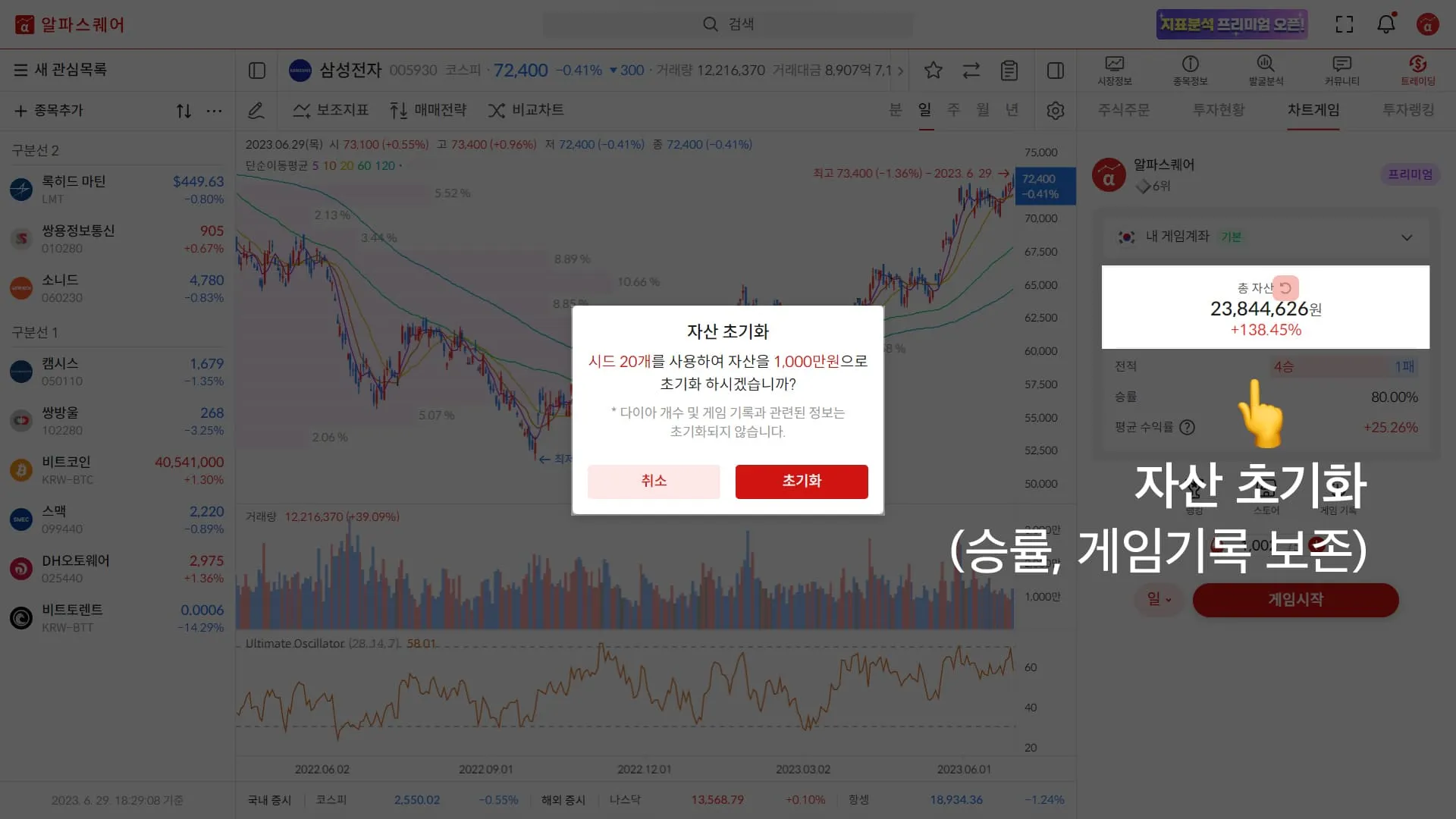 차트게임의 자산 및 계좌 초기화 기능이 추가되었습니다.