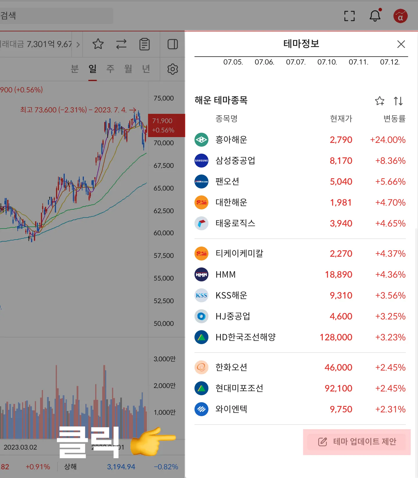 스마트 탭 내 테마종목 우측 상단 혹은 테마 정보의 우측 하단에서 [테마 업데이트 제안] 버튼을 통해 제보하실 수 있으며, 제안한 내용은 검토 후 반영 여부가 결정됩니다.