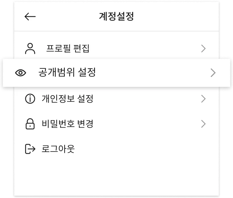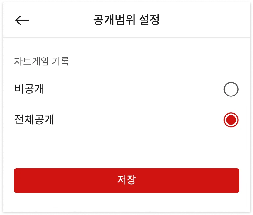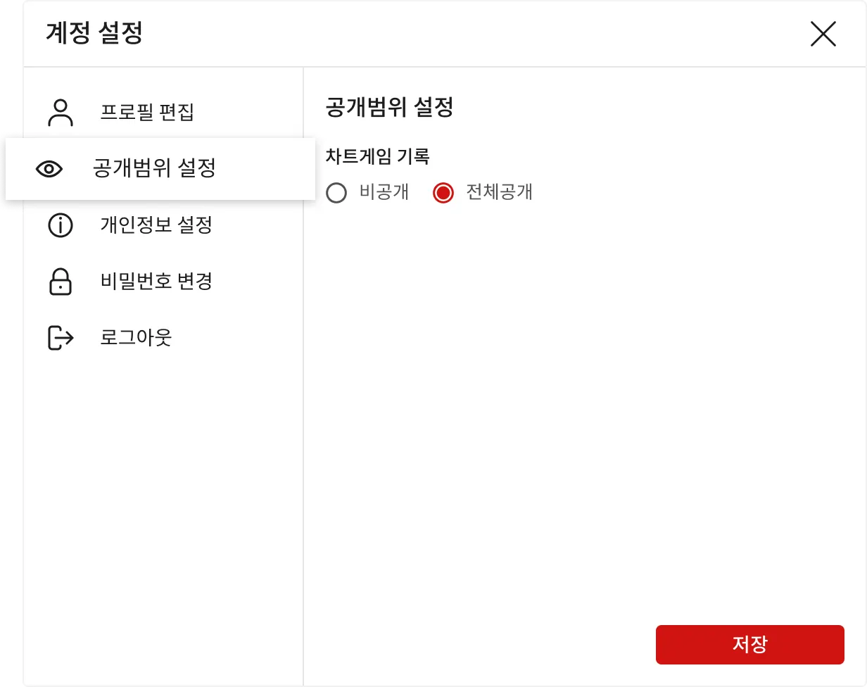 [계정설정] - [공개범위 설정]에서 내 차트게임 정보의 공개여부를 설정할 수 있게 됩니다.