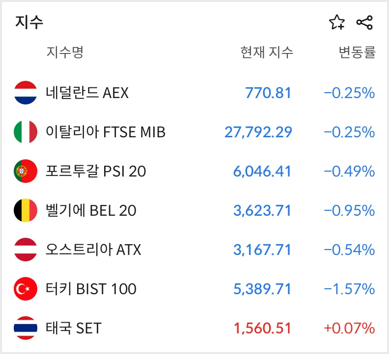 네덜란드, 이탈리아, 포르투갈 등 총 7개의 해외지수가 업데이트 되었습니다.