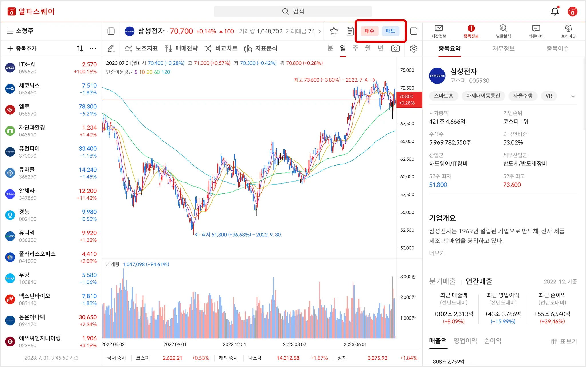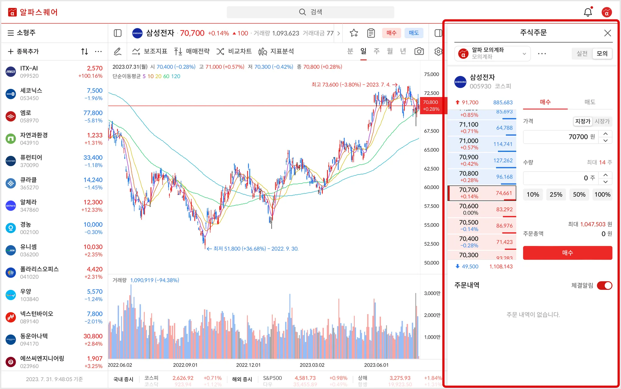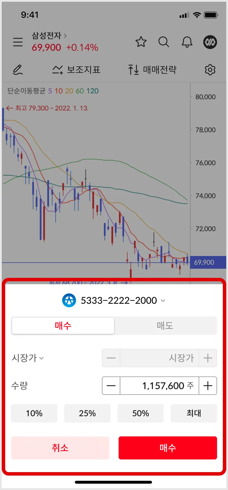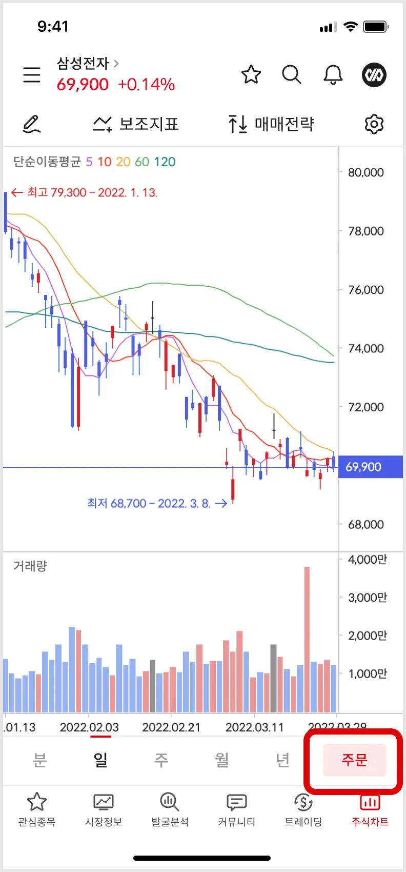 다른 탭을 보고 있다가도 차트 내 매수, 매도 버튼을 클릭하시면 언제든 주식주문을 하실 수 있습니다.