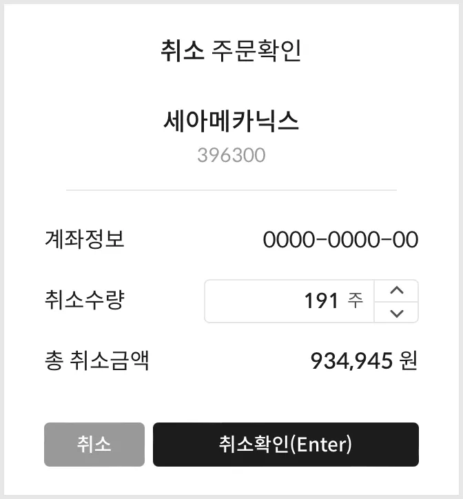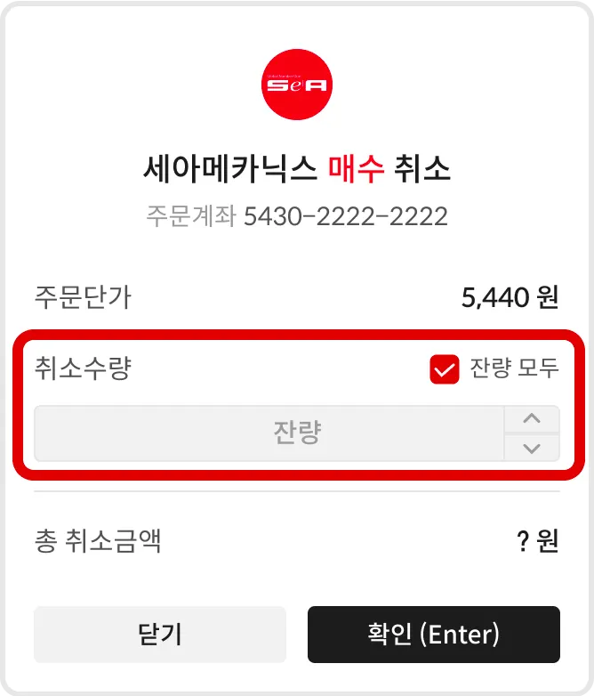 미체결 잔량 모두 취소하는 옵션이 기본으로 선택되어 취소 주문 시 오류 없이 바로 취소하실 수 있게 됩니다.