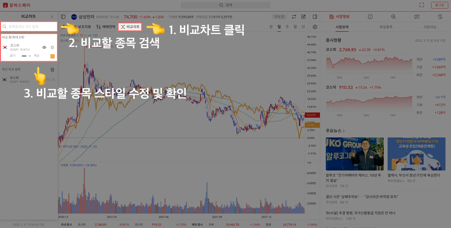 비교차트는 내가 보고 싶은 종목의 차트와 다른 종목 또는 지수 차트를 비교할 수 있도록 도와주는 기능입니다. (분봉차트는 추후 도입될 예정입니다.)