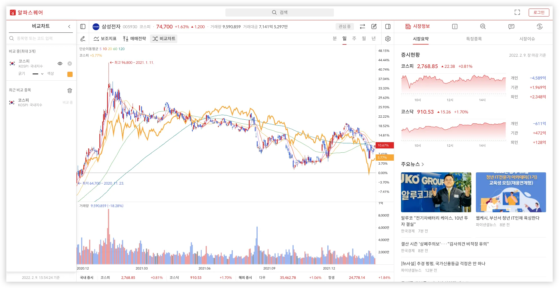 알파스퀘어 비교차트 적용예시 (노란색: 코스피 / 메인종목: 삼성전자)