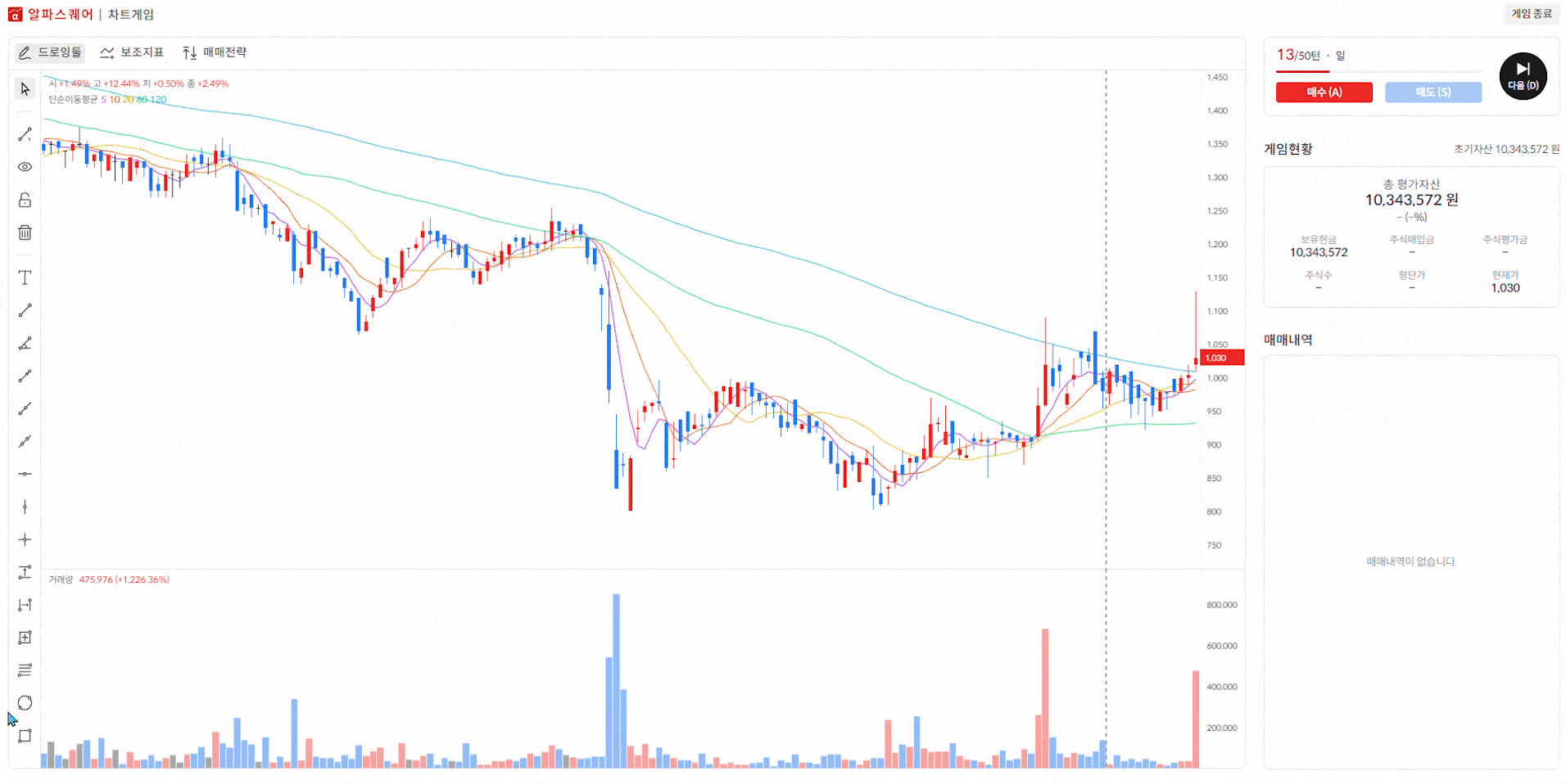 알파스퀘어에서는 실제 과거 차트를 기반으로 매매 대응을 연습할 수 있는 차트게임을 제공하고 있습니다.
