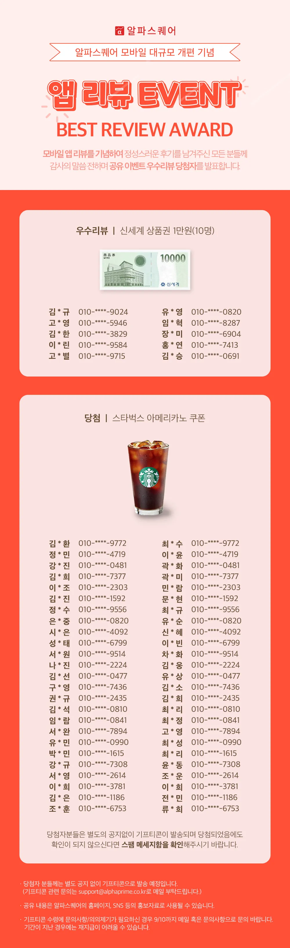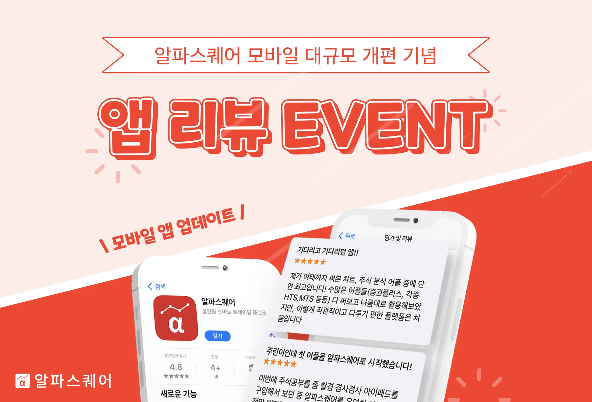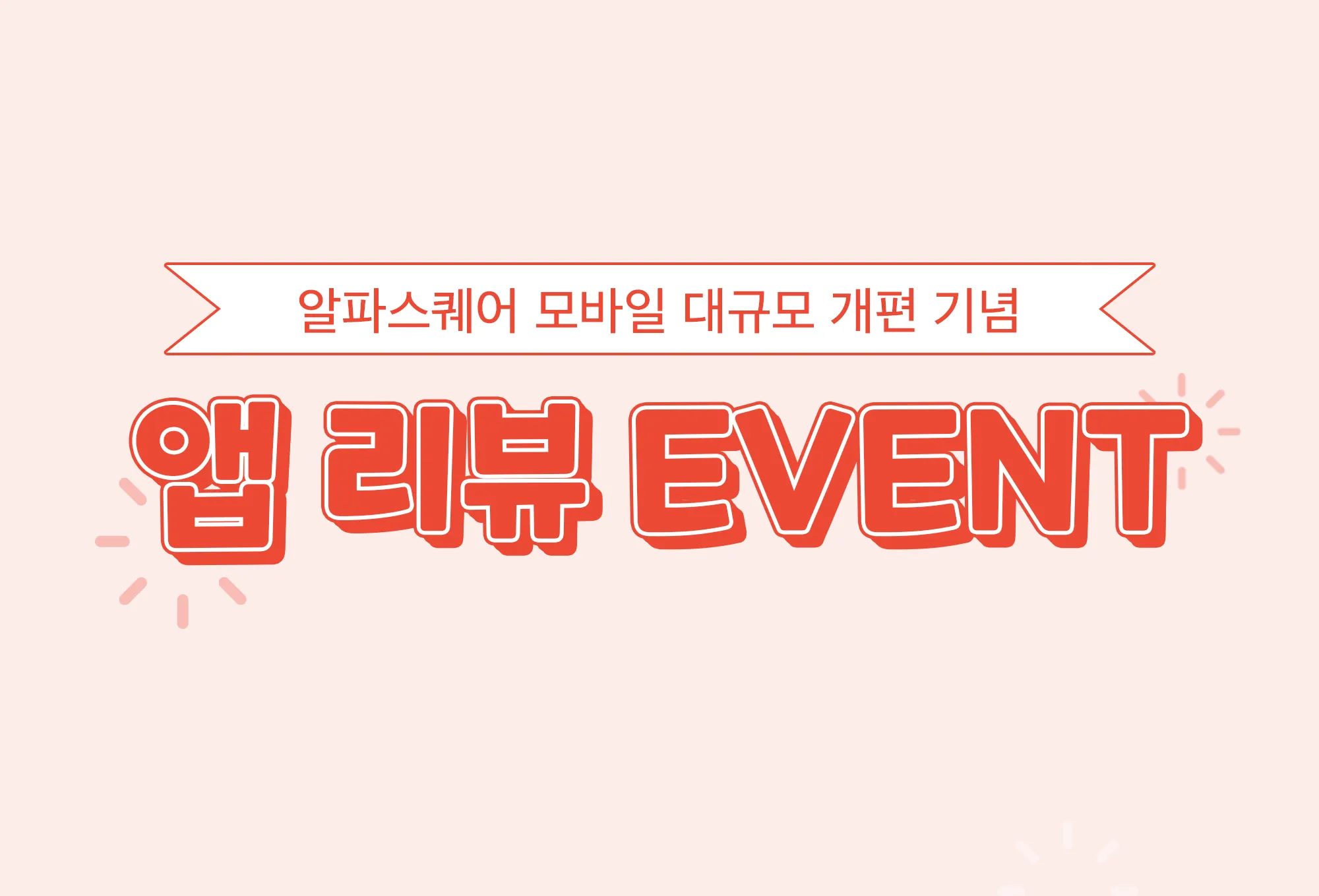 저희 알파스퀘어가 이번 모바일 대규모 개편 기념으로 앱 리뷰 이벤트를 진행하게 되었습니다.