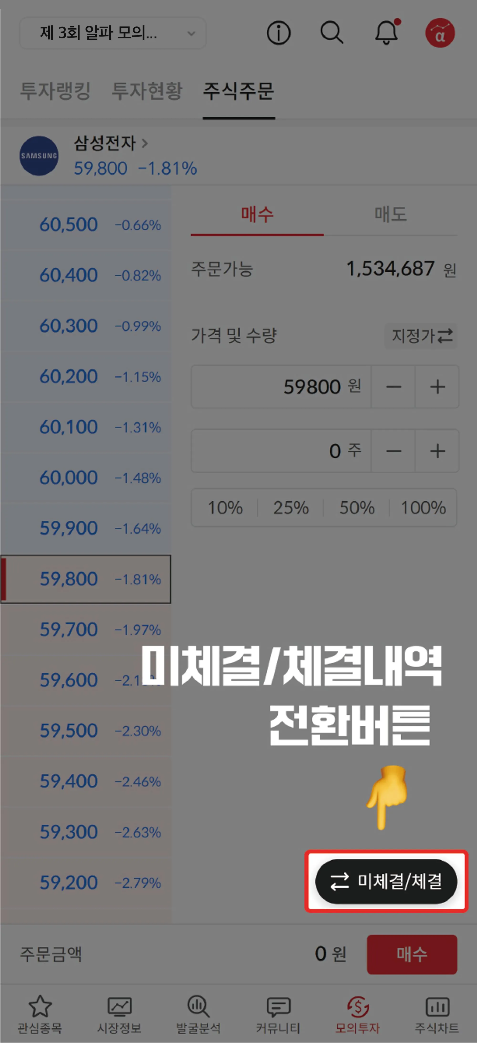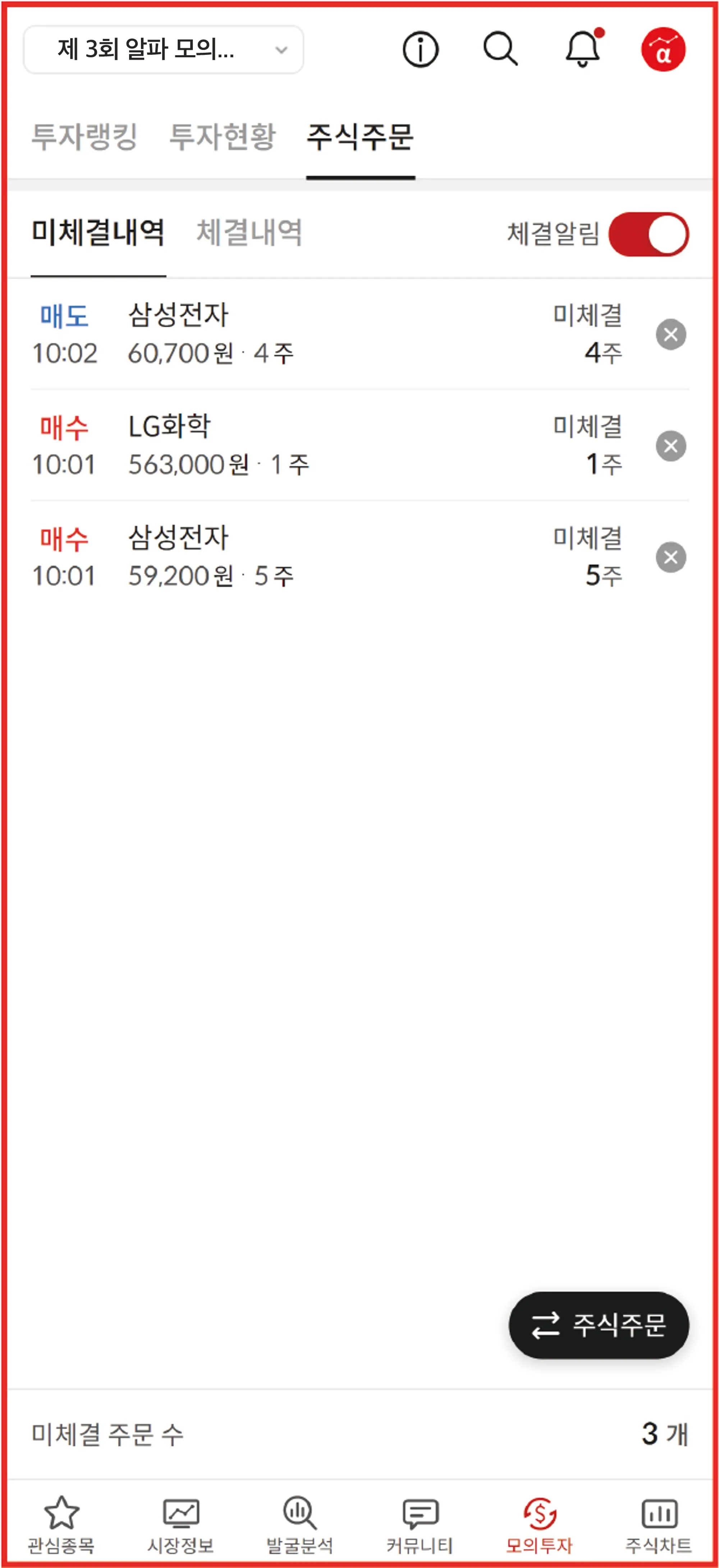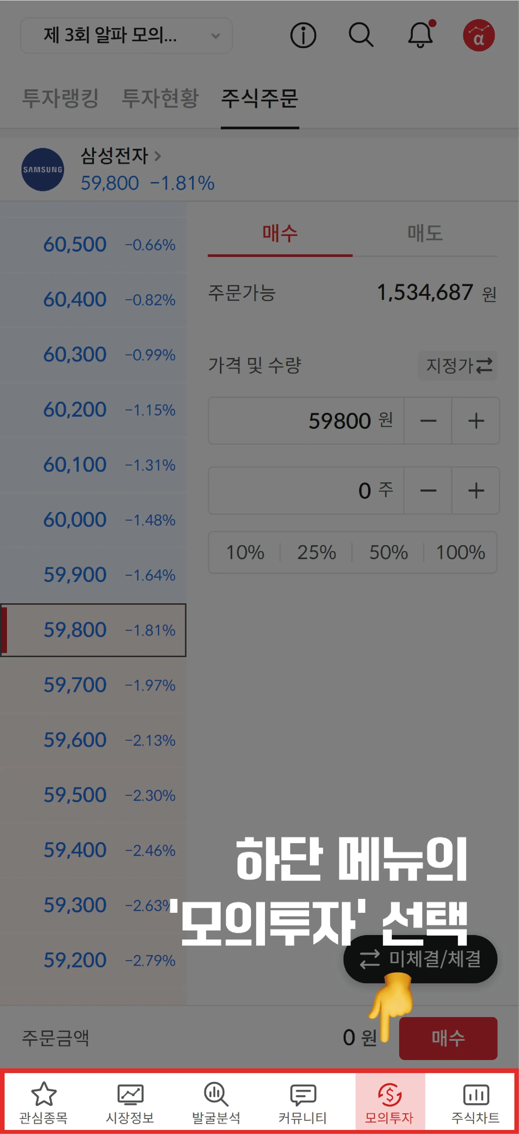 알파스퀘어 앱 오른쪽 하단의 ‘모의 투자’ 메뉴 → ‘주식주문’ 탭 클릭