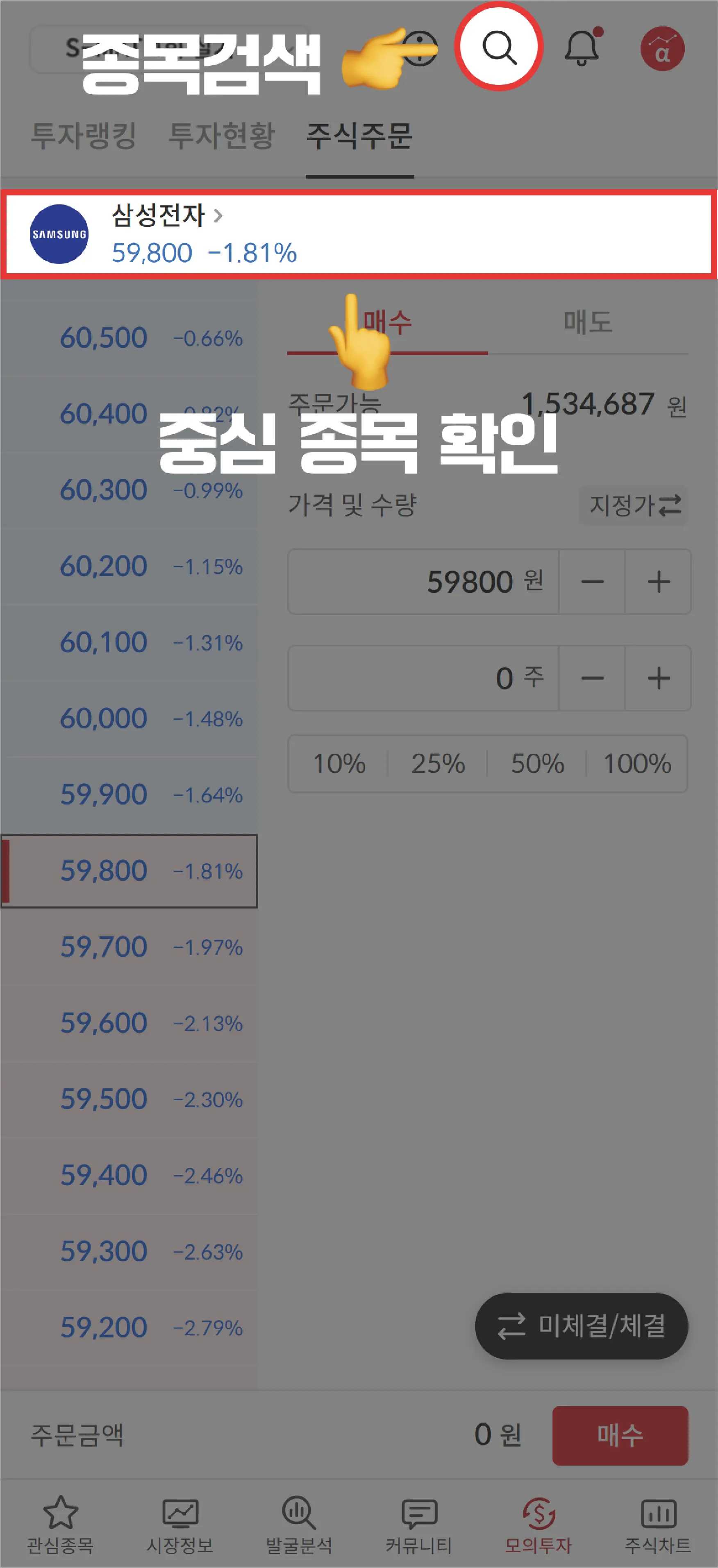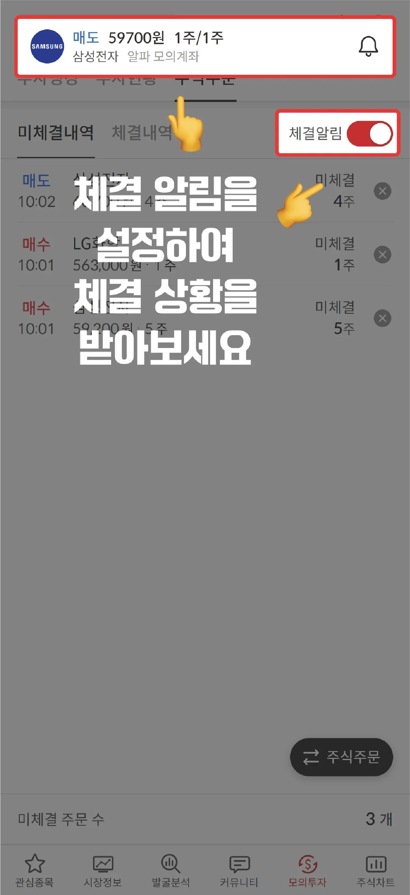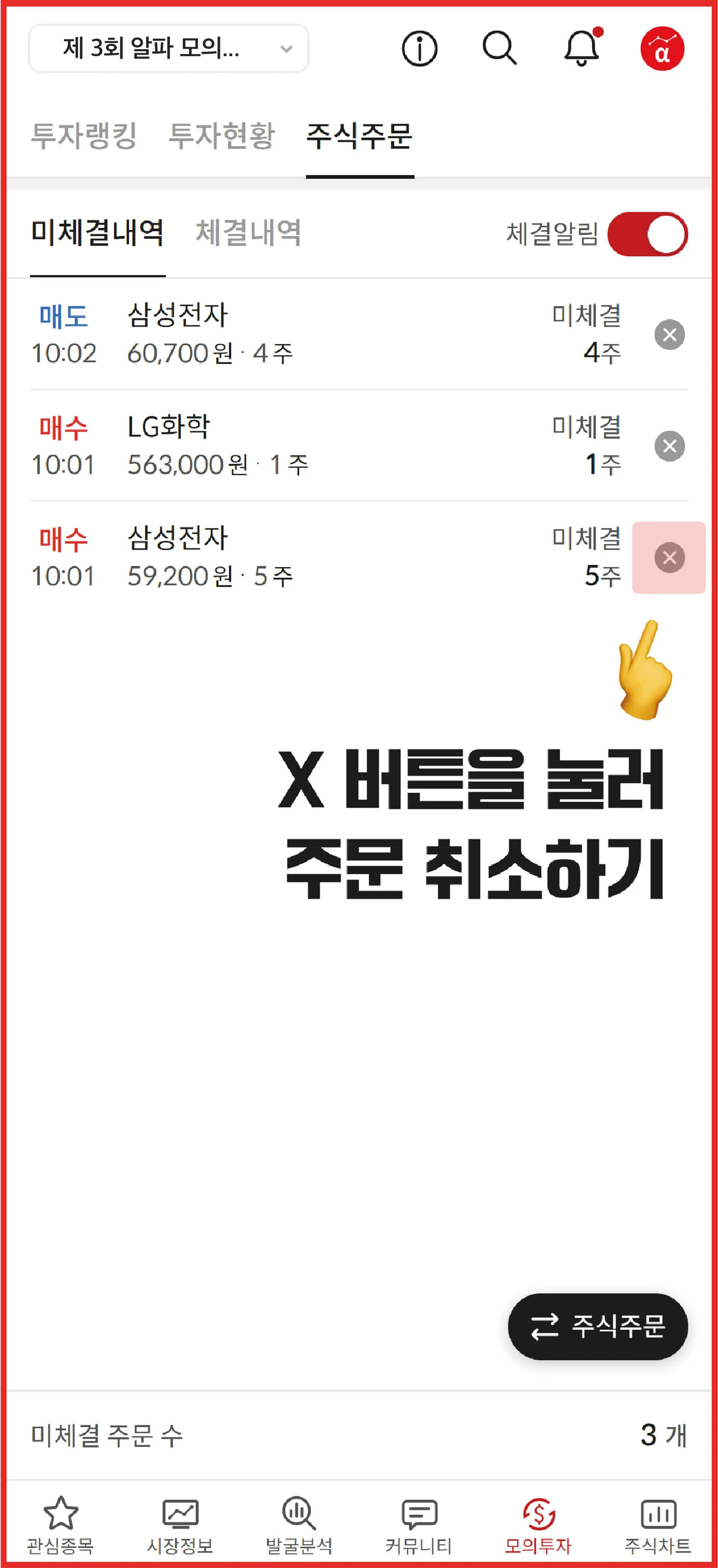 알파스퀘어 앱 오른쪽 하단의 ‘모의 투자’ 메뉴 → ‘주식주문’ 탭 클릭