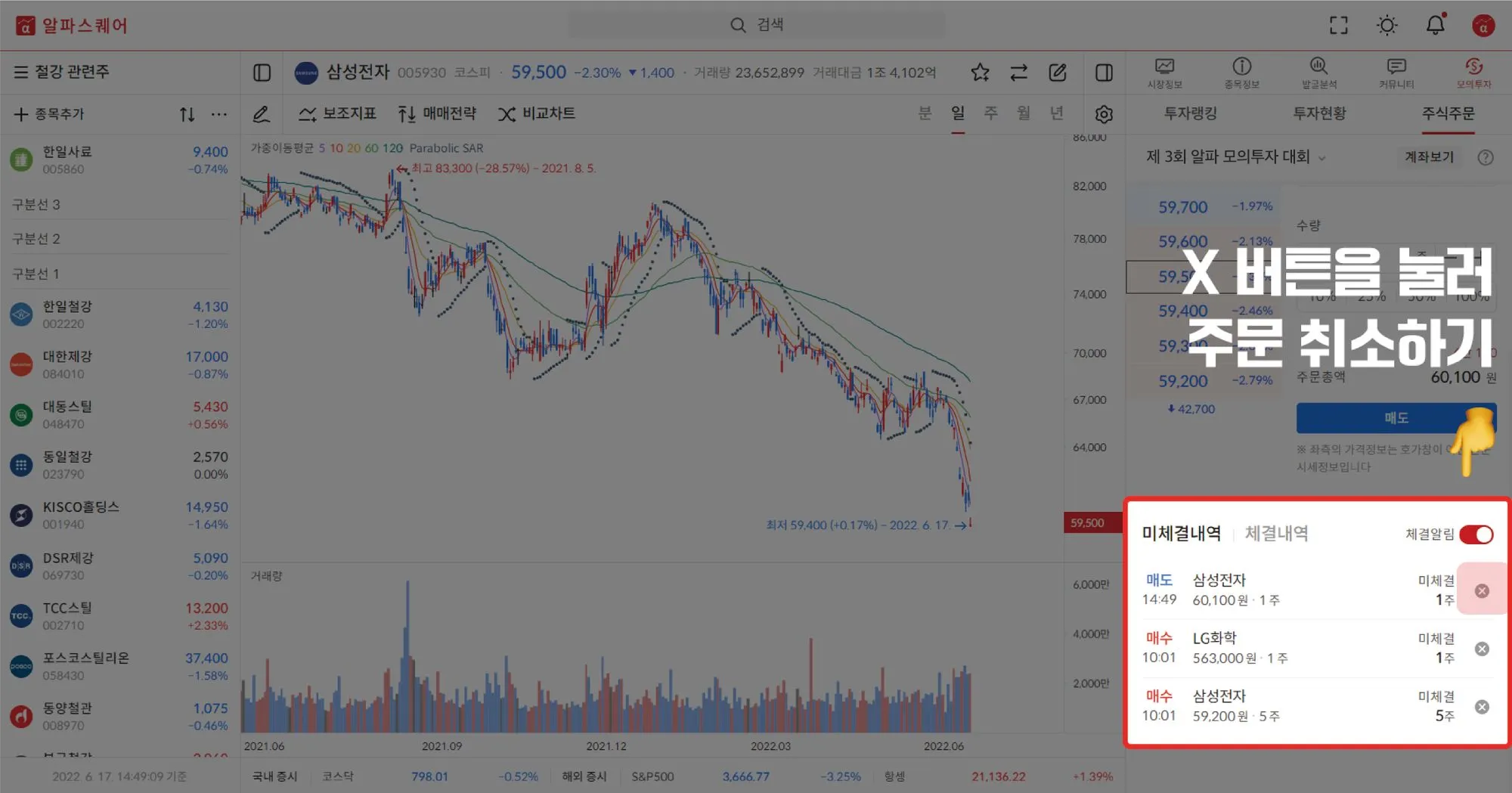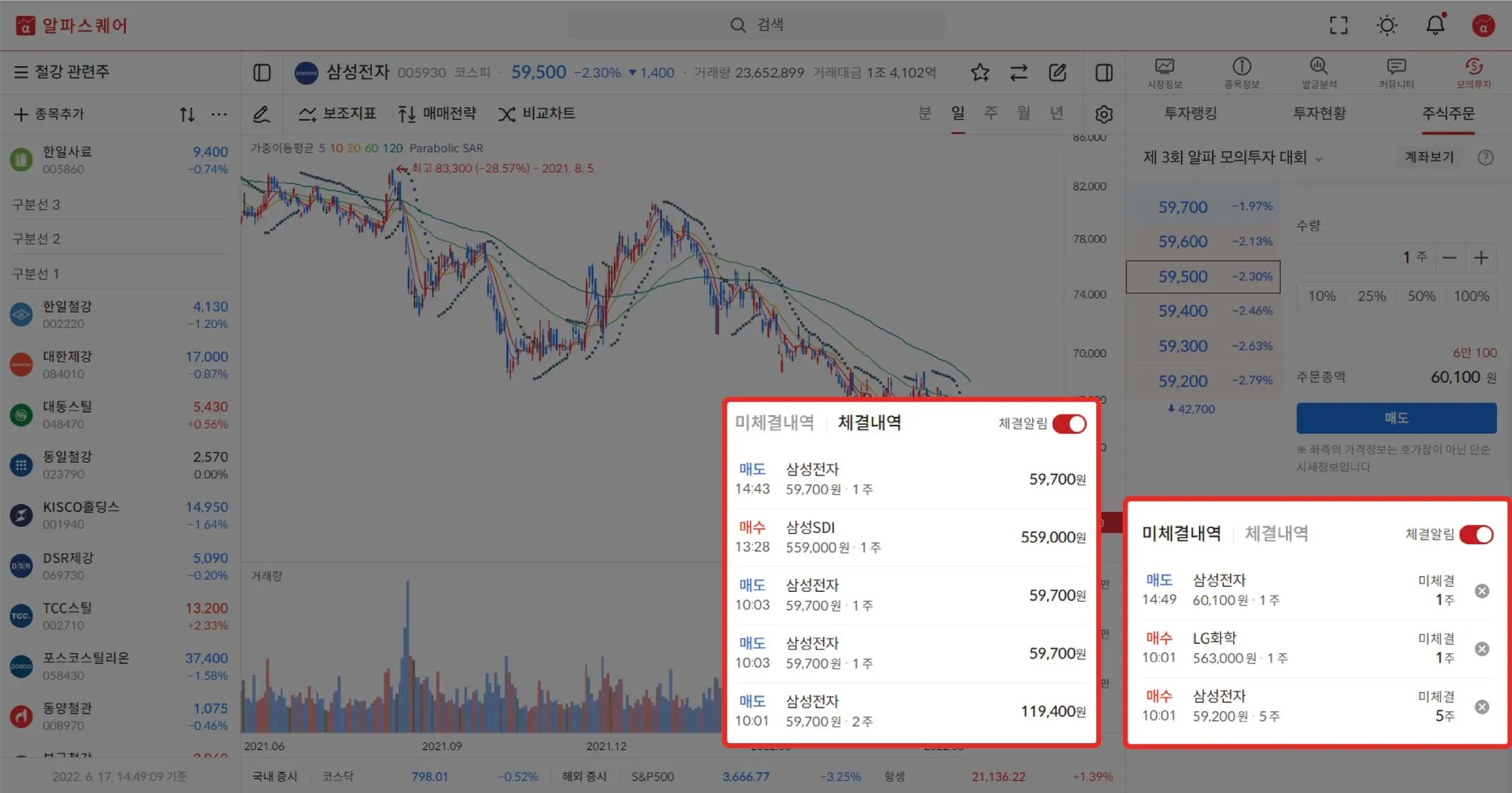 알파스퀘어의 모의투자는 타증권사들의 모의투자와 동일하게 실제 장의 체결 거래량을 기반으로 체결 여부가 결정됩니다. 따라서 거래량이 충분히 발생하지 않으면 모의투자의 주문 역시 체결되지 않으며, 거래수수료는 0.15%, 세금은 0.23%를 기준으로 합니다.