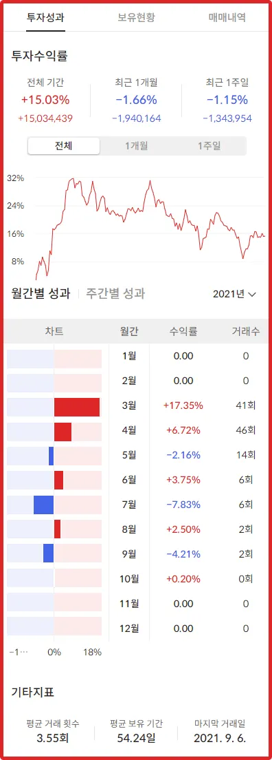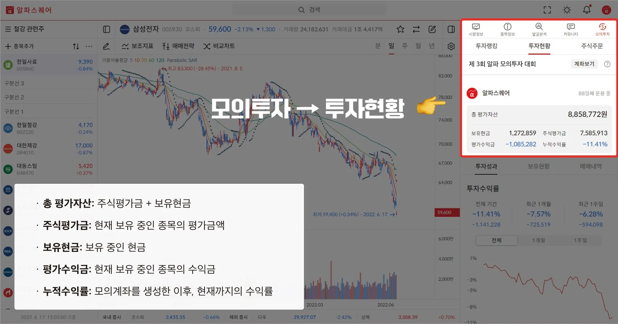 투자성과: 내 모의계좌의 수익률 변화를 한눈에 볼 수 있습니다.
