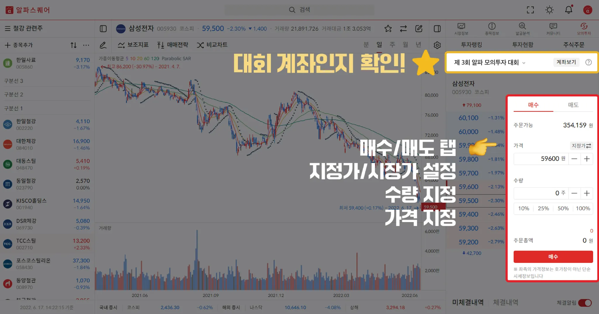 주문 설정하기 ※ 대회용 계좌인지 한번 더 확인하세요!