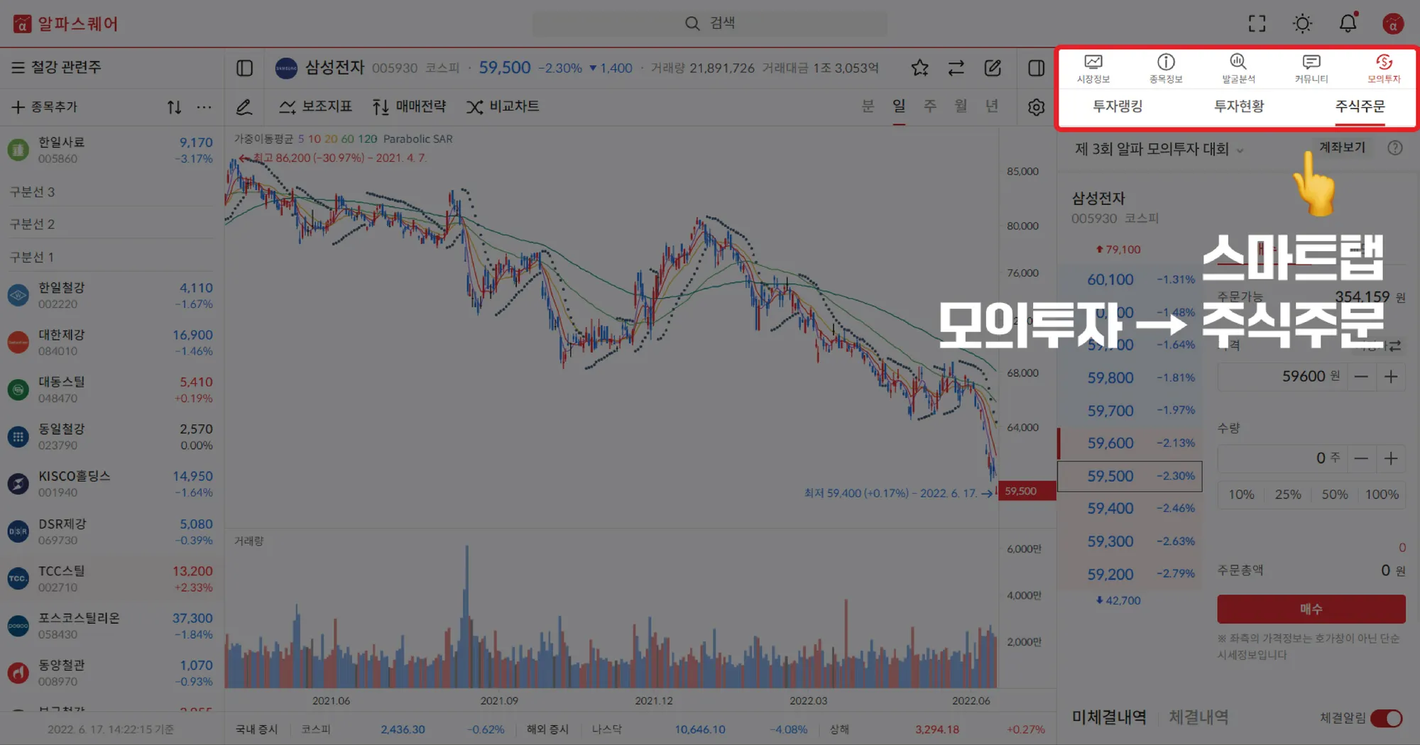 알파스퀘어 오른쪽 상단의 ‘모의투자’ 메뉴 → ‘주식주문’ 탭 클릭
