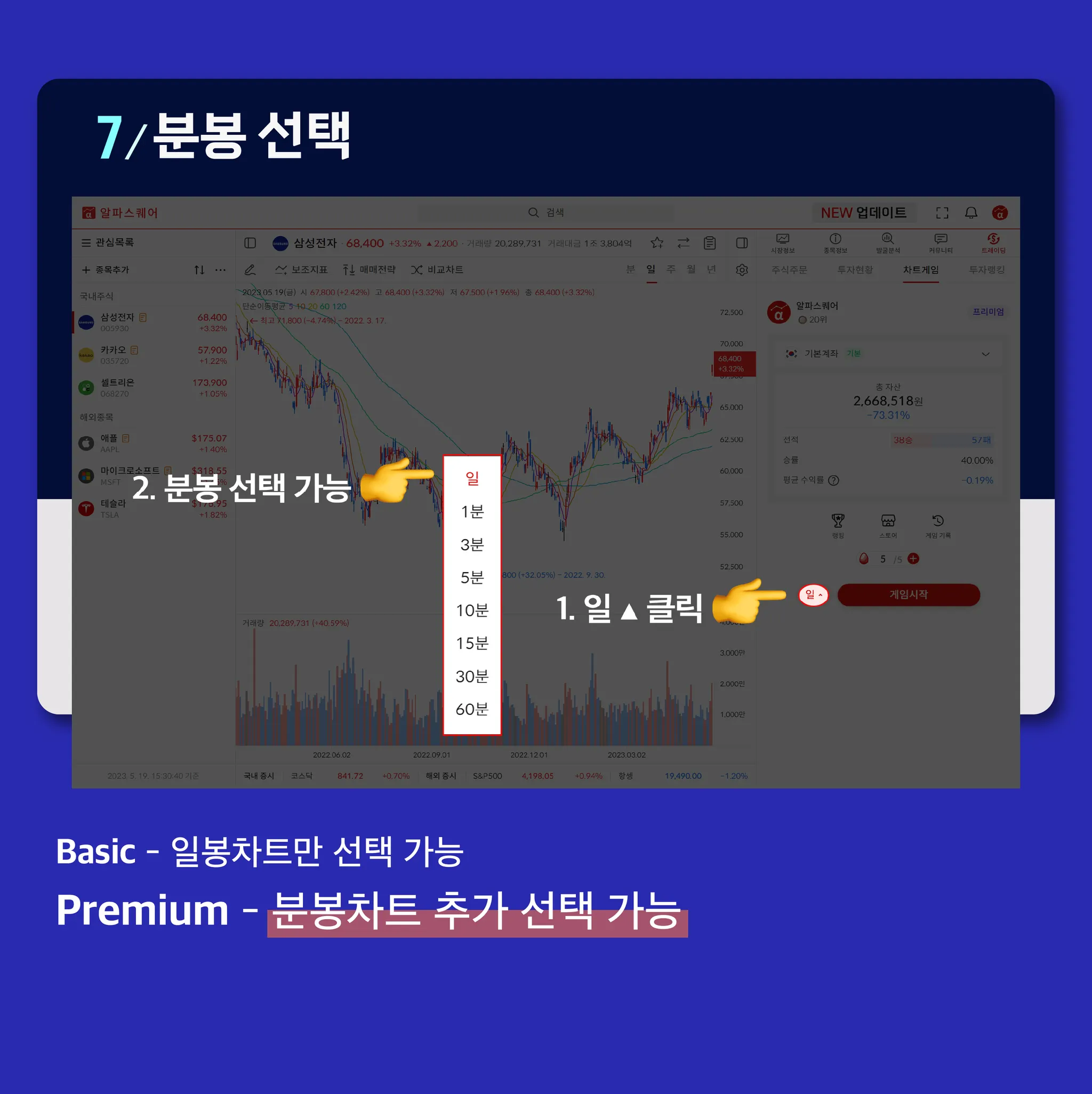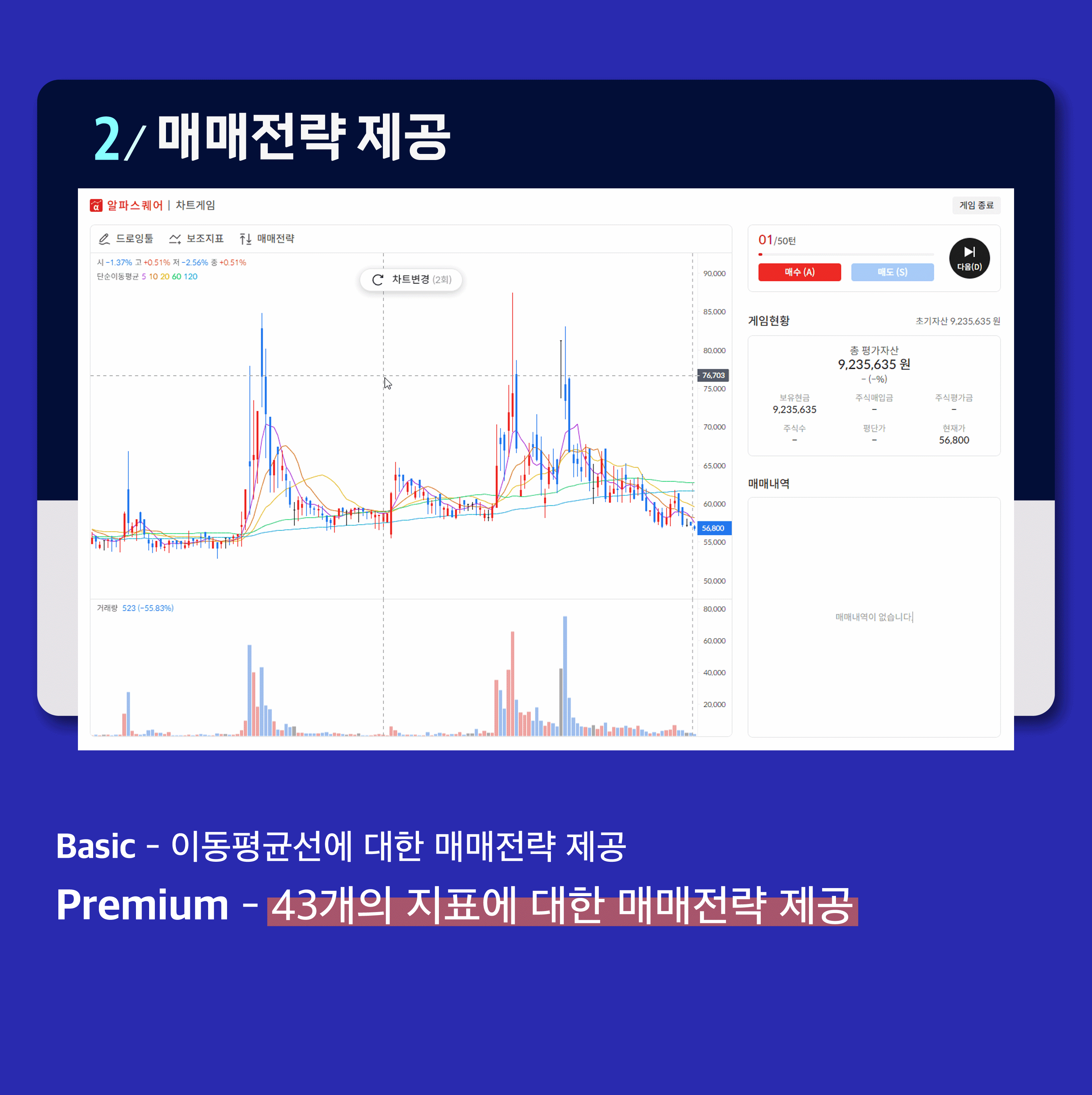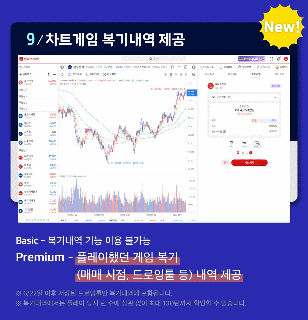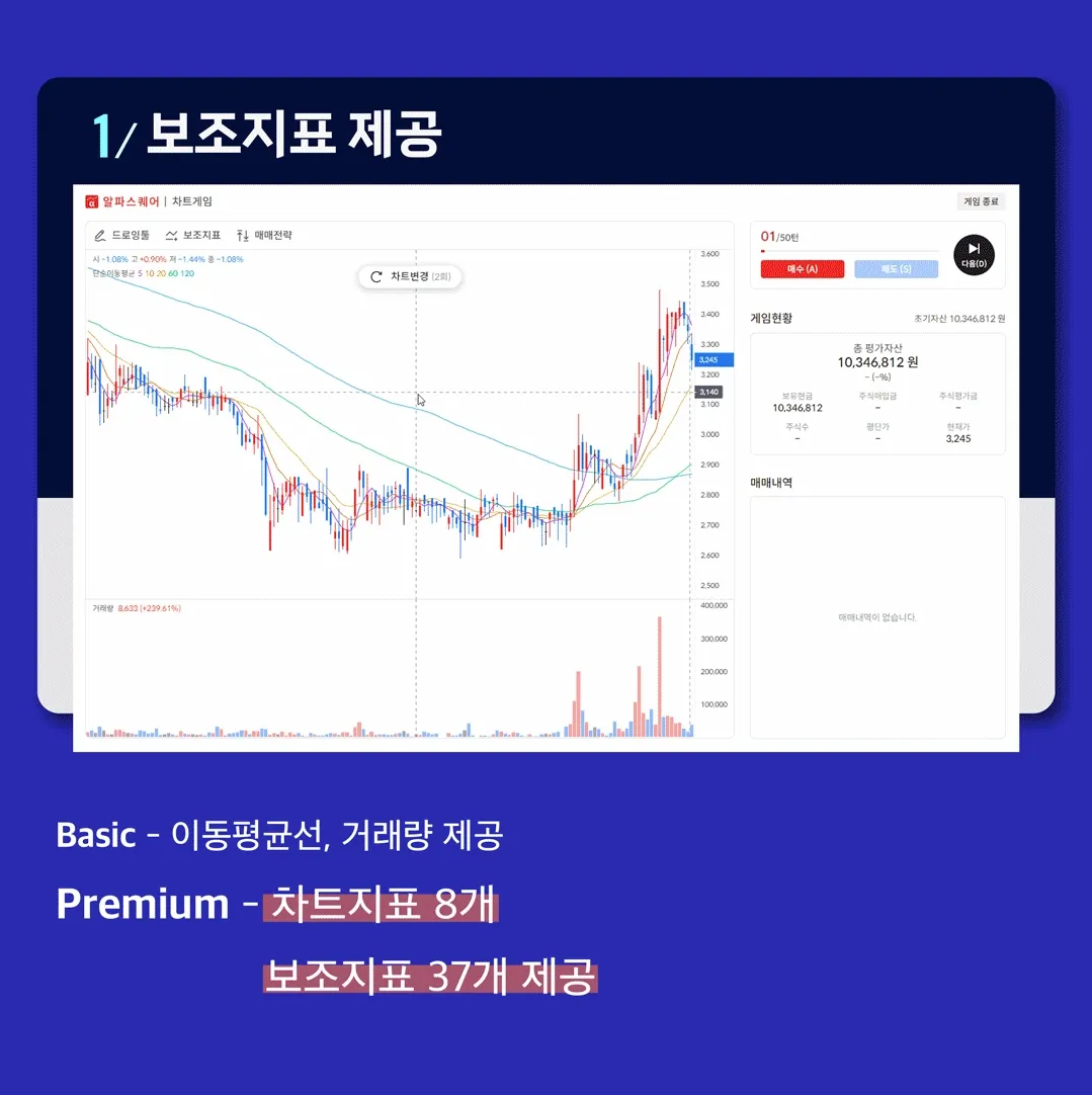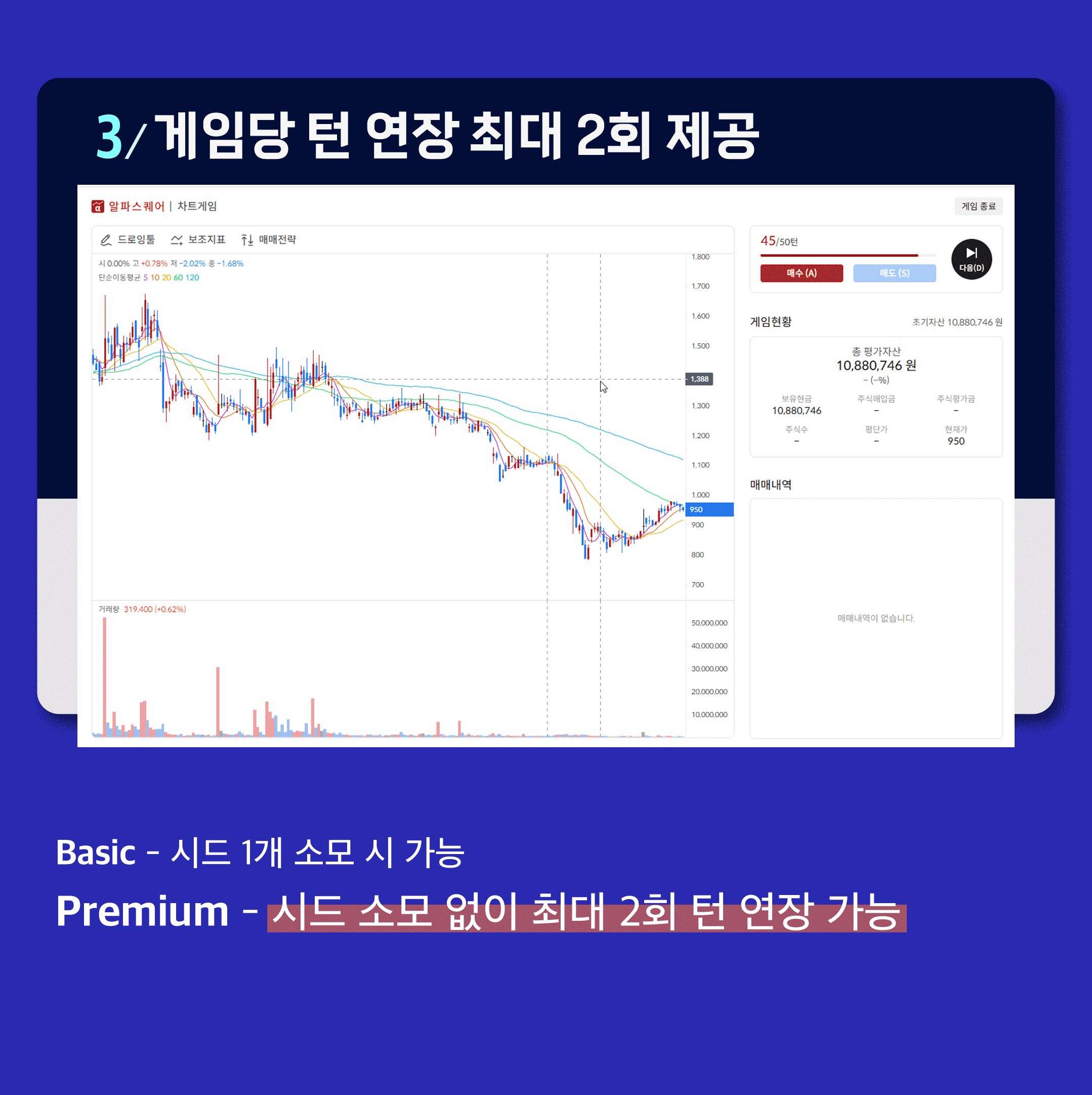 차트게임 프리미엄 플랜은 보조지표, 차트변경, 국내/해외/가상화폐 제공, 턴연장 등 9가지의 고급 기능을 사용할 수 있습니다. 프리미엄 플랜 구독하고 더 높은 수익률을 노려보세요!