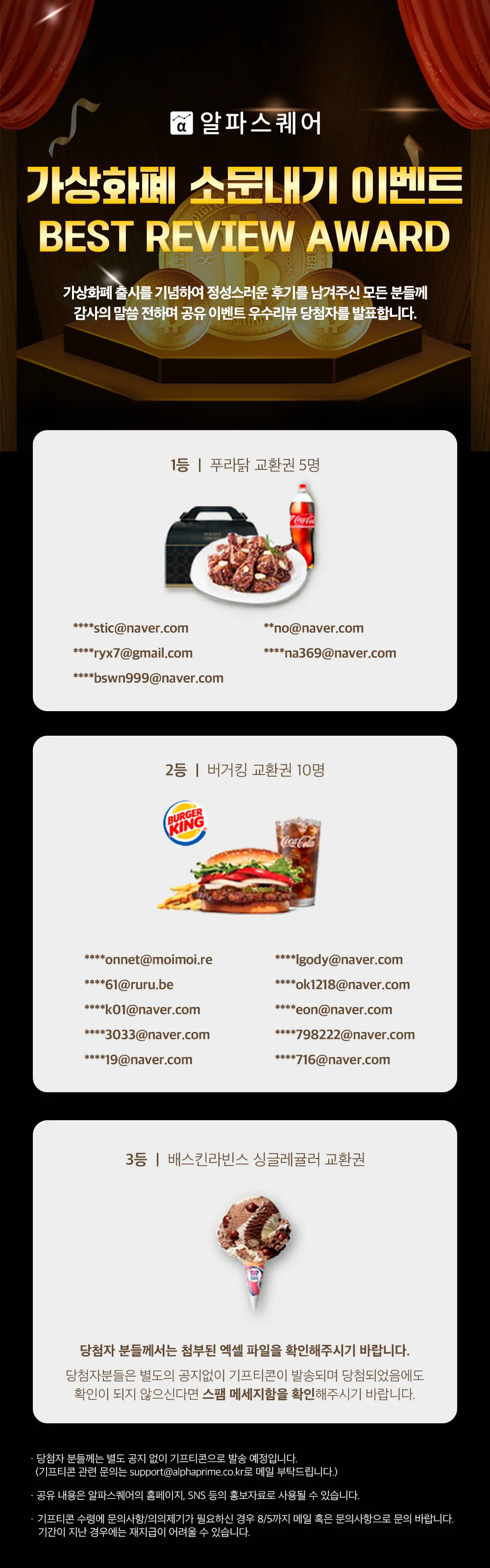 1등, 2등(우수 리뷰)은 알파스퀘어 팀 내부에서 논의 후 공정히 선별할 예정입니다.