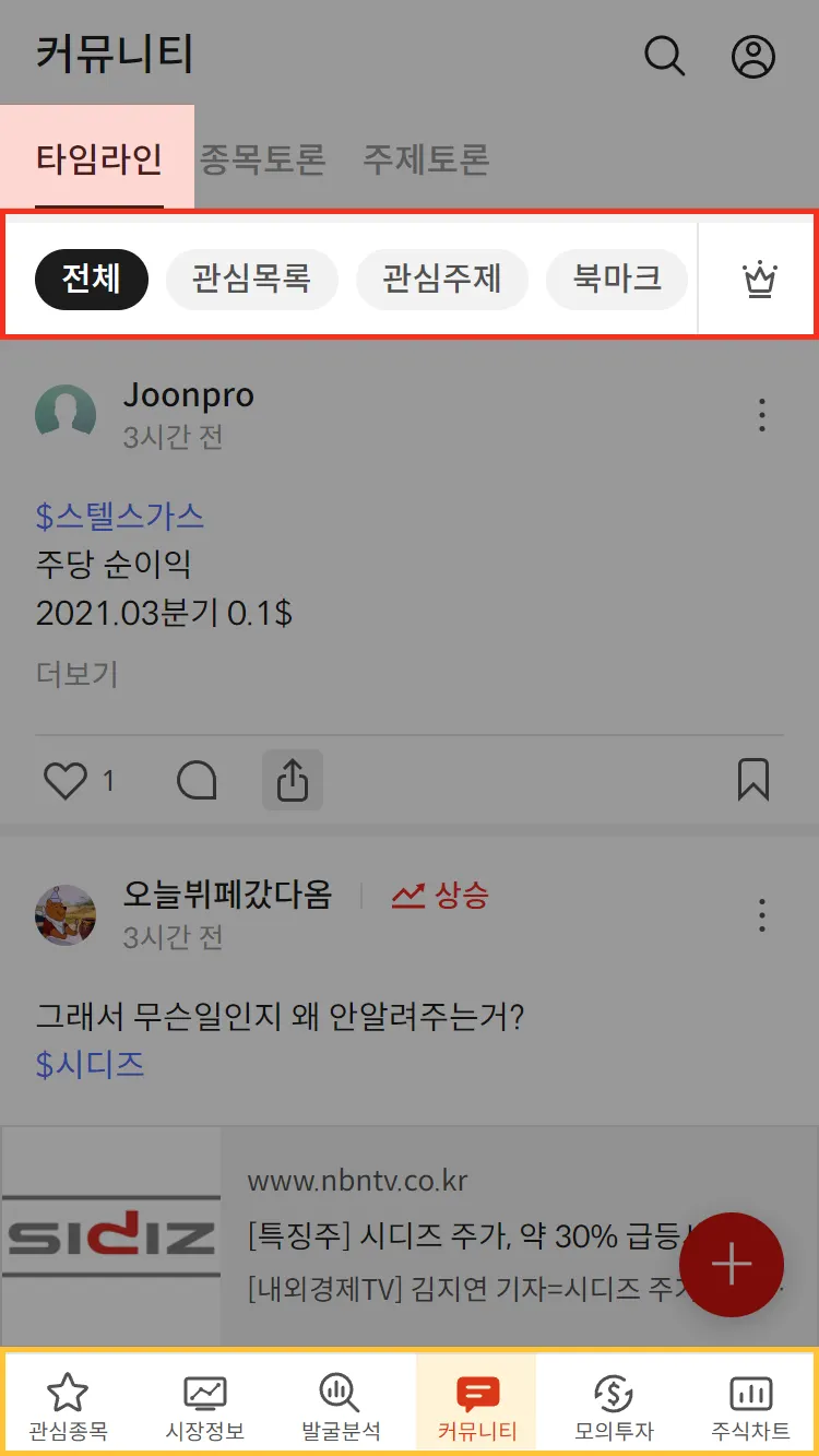 타임라인은 커뮤니티에 올라오는 모든 글들을 모아볼 수 있는 기능입니다. 소분류 탭을 통해 나만의 필터를 사용해보세요.