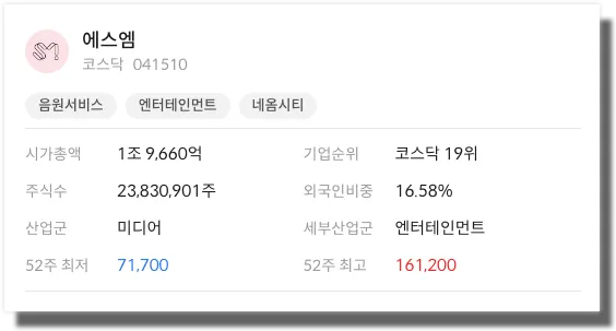 에스엠은 1995년 2월 설립된 기업으로 음악 콘텐츠 사업과 매니지먼트 사업 등을 영위하고 있습니다.