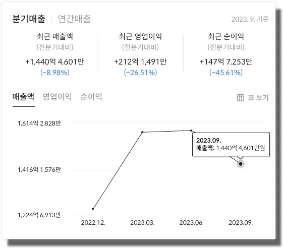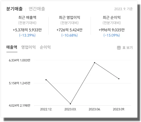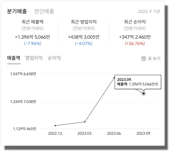 와이지엔터테인먼트 의 2023년 3분기 매출의 경우 전분기 대비 8.98% 감소했습니다. 영업이익 또한 전분기 대비 26.51% 감소했으며, 순이익은 45.61% 감소한 모습을 보였습니다. 와이지엔터테인먼트의 더 자세한 재무정보가 궁금하다면 위의 이미지를 클릭하시면 확인하실 수 있습니다.