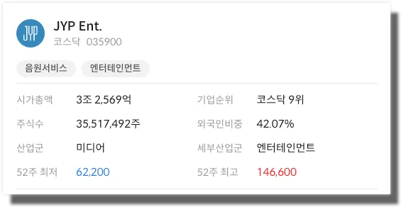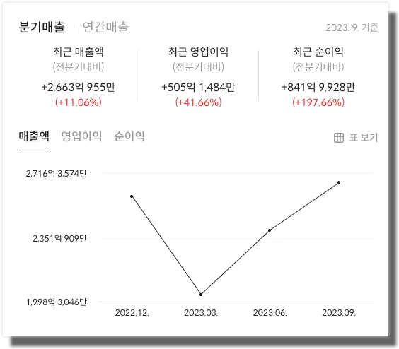 JYP Ent. 의 2023년 3분기 매출의 경우 전분기 대비 7.96% 감소했습니다. 영업이익 또한 전분기 대비 4.07% 감소했으며, 순이익은 36.76% 증가한 모습을 보였습니다. JYP Ent.의 더 자세한 재무정보가 궁금하다면 위의 이미지를 클릭하시면 확인하실 수 있습니다.