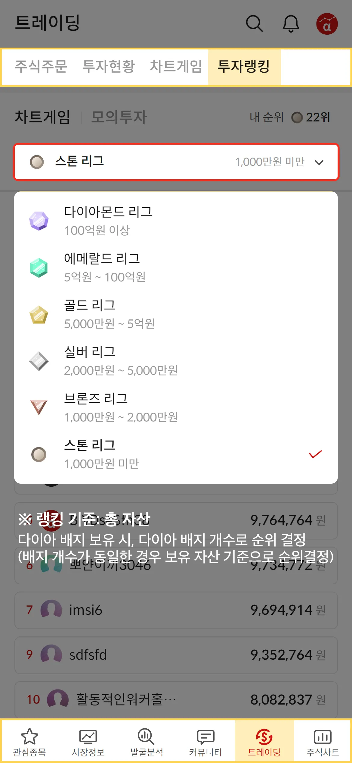 * 다이아 배지 보유 시, 다이아 배지 개수로 순위 결정(배지 개수가 동일한 경우 보유 자산 기준으로 순위 결정)