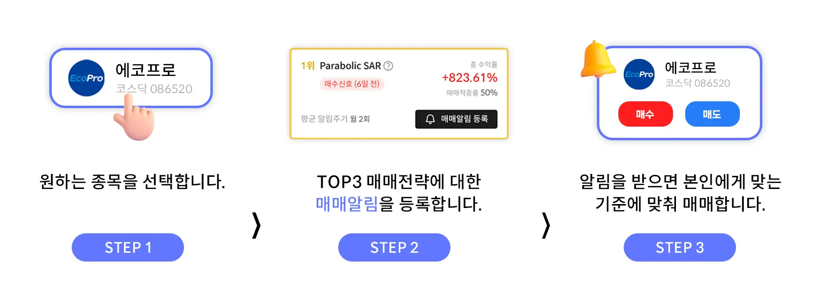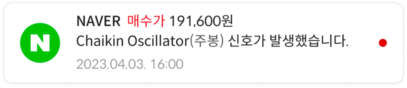 현재 보고 있는 종목, 가장 최적화 된 매수, 매도 타이밍을 알림으로 받아 볼 수 있습니다.