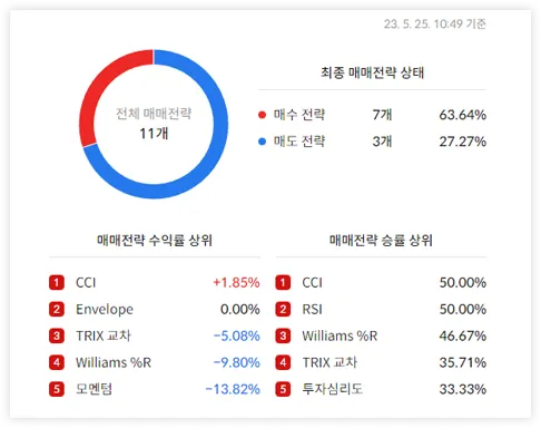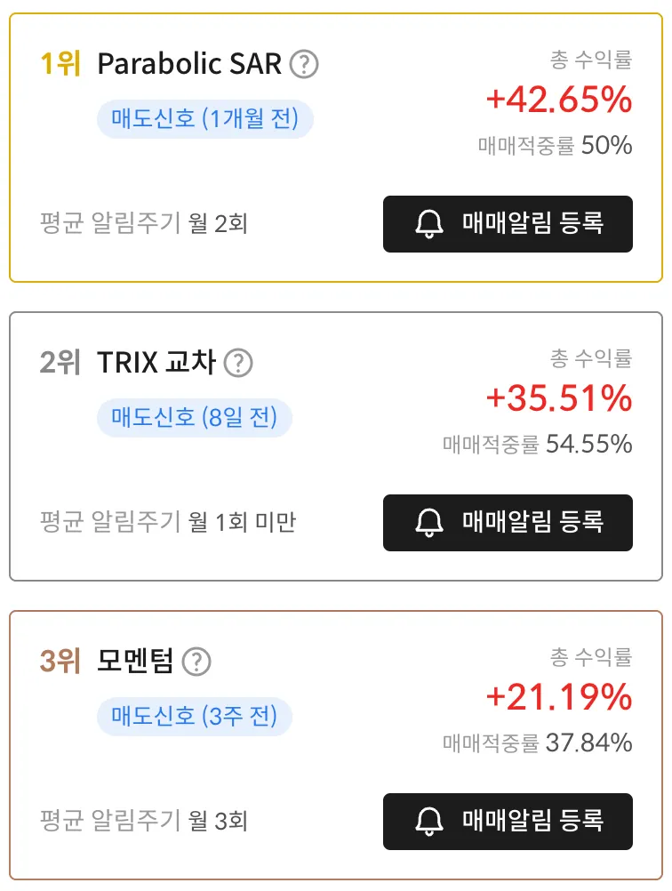 현재 보고 있는 종목의 매매전략 중 가장 높은 수익률을 내고 있는 TOP3 전략들을 확인할 수 있습니다. 각 전략 별 수익률과 적중률을 통해 나에게 어떤 전략이 맞는지 판단할 수 있습니다.