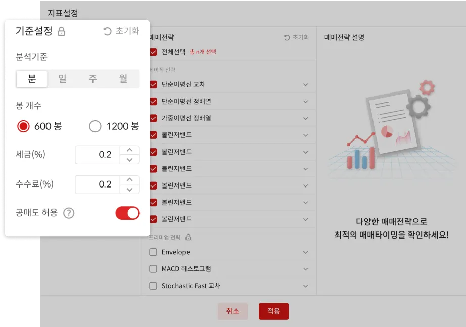지표별 기준을 세부설정하여 나에게 맞는 전략을 만들 수 있습니다.