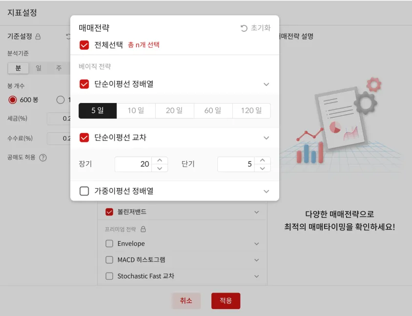 해당 기능을 이용하면 어떤 보조지표와 매매 전략이 내 종목에 최고의 성능을 내는지 쉽게 파악할 수 있습니다.